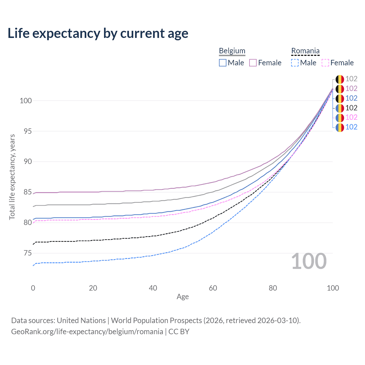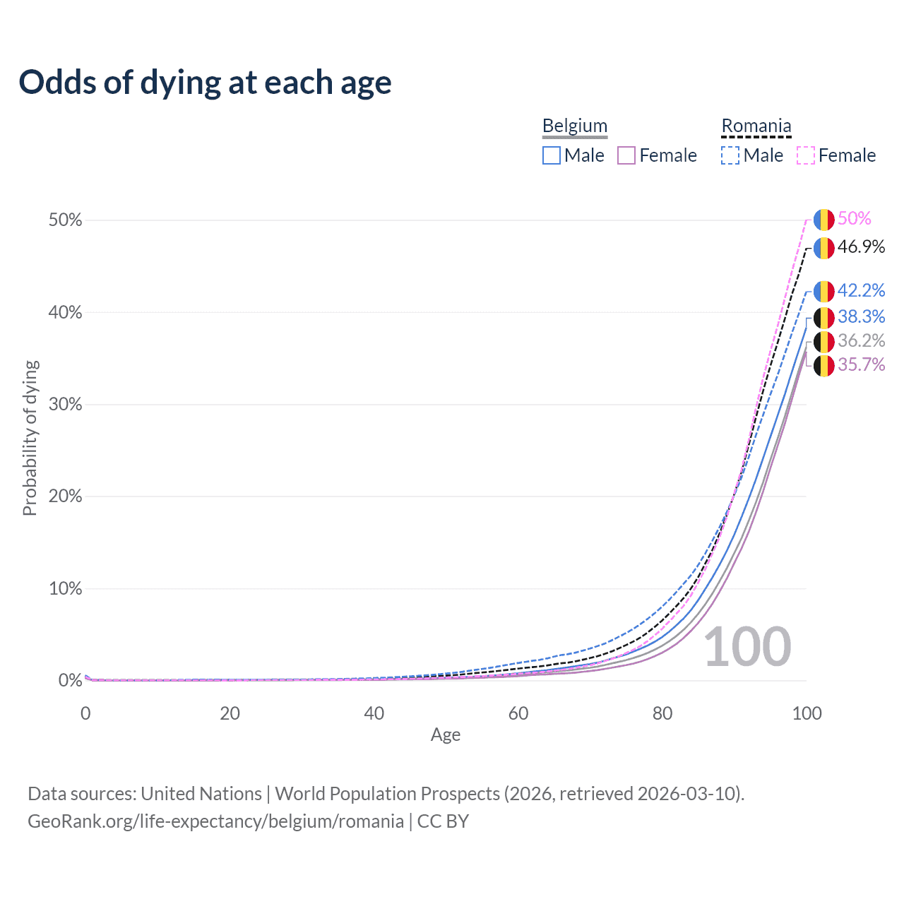 This life expectancy calculator shows the odds of living to 100, 95, 90, and below based on current age for both males and females in Belgium and Romania, along with mean and median age of death. The calculations are based on the 2026 life tables (actuarial tables) from the UN World Population Prospects.