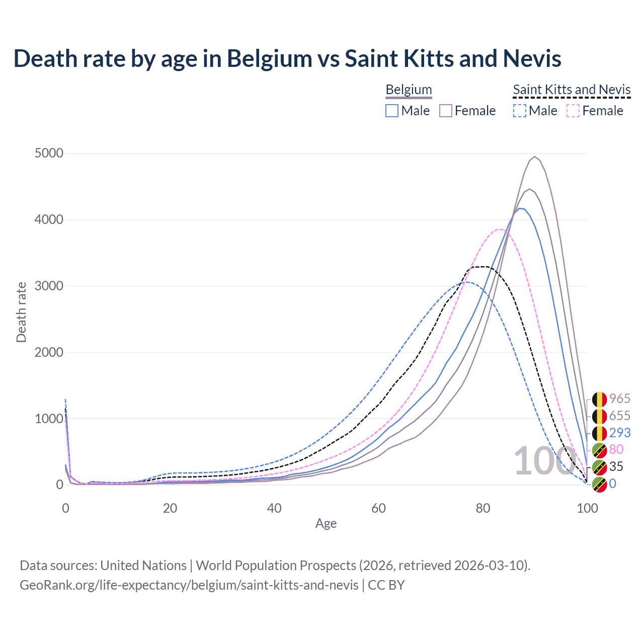 In Belgium, the most common age of death is 89, compared to 80 in Saint Kitts and Nevis. The median age of death is 85.8 in Belgium and 76.3 in Saint Kitts and Nevis, meaning only half of each cohort is expected to live past that age.