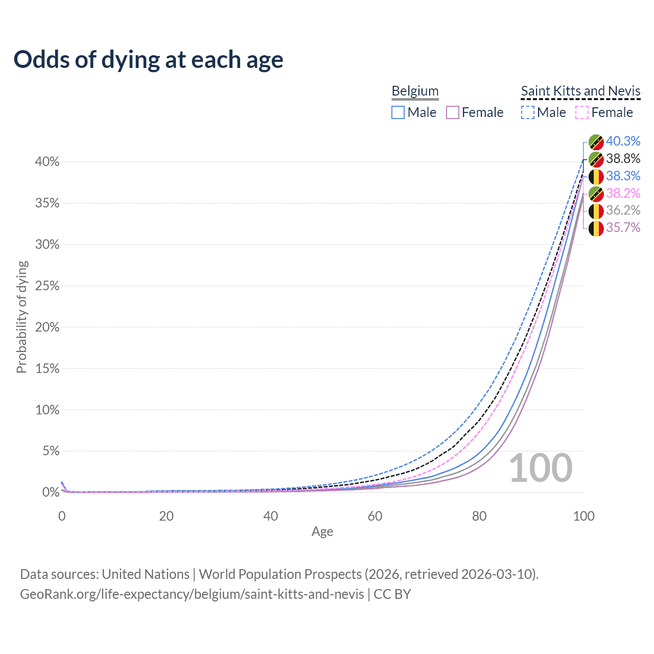 This life expectancy calculator shows the odds of living to 100, 95, 90, and below based on current age for both males and females in Belgium and Saint Kitts and Nevis, along with mean and median age of death. The calculations are based on the 2026 life tables (actuarial tables) from the UN World Population Prospects.