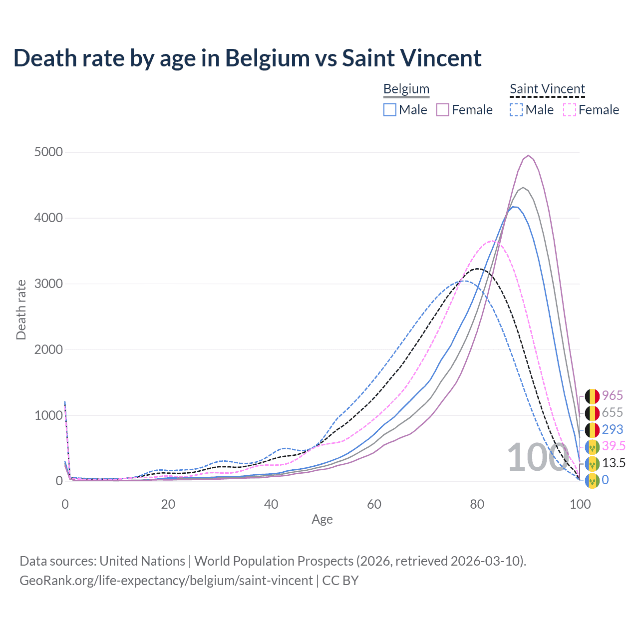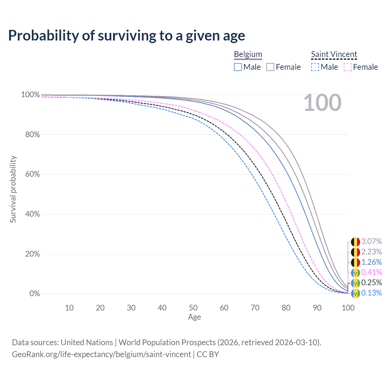 This life expectancy calculator shows the odds of living to 100, 95, 90, and below based on current age for both males and females in Belgium and Saint Vincent, along with mean and median age of death. The calculations are based on the 2026 life tables (actuarial tables) from the UN World Population Prospects.