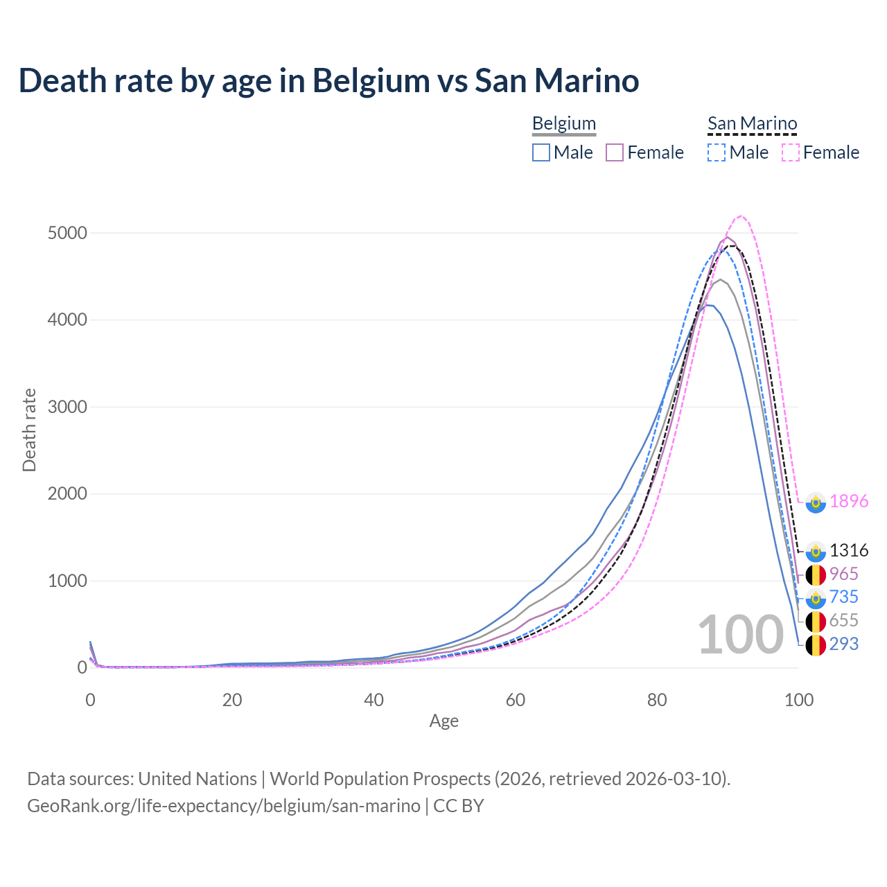 In Belgium, the most common age of death is 89, compared to 91 in San Marino. The median age of death is 85.8 in Belgium and 88.3 in San Marino, meaning only half of each cohort is expected to live past that age.