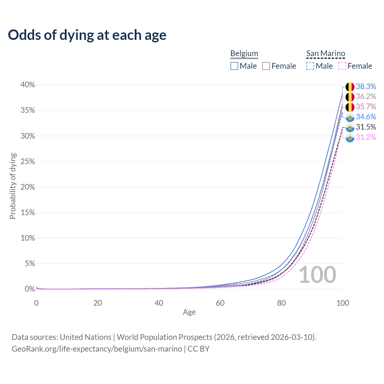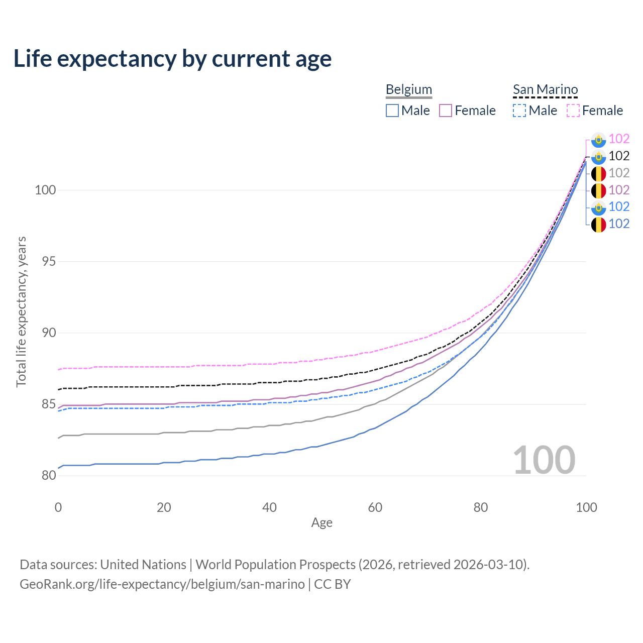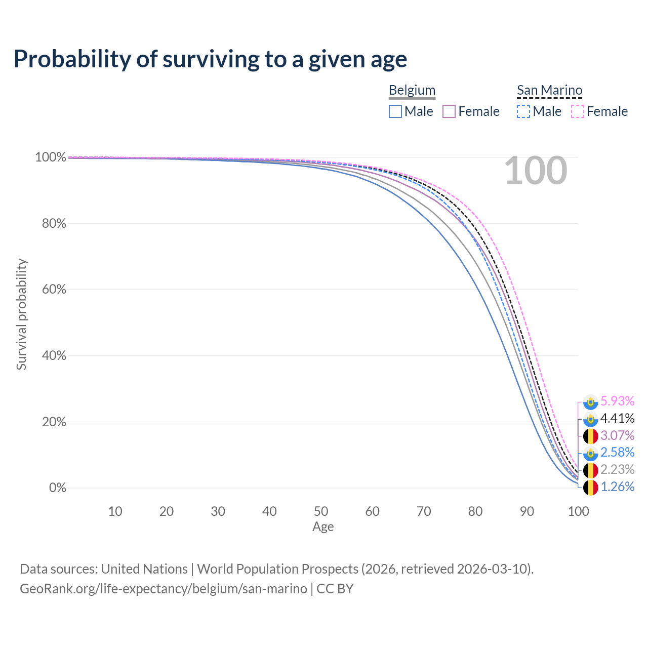 This life expectancy calculator shows the odds of living to 100, 95, 90, and below based on current age for both males and females in Belgium and San Marino, along with mean and median age of death. The calculations are based on the 2026 life tables (actuarial tables) from the UN World Population Prospects.