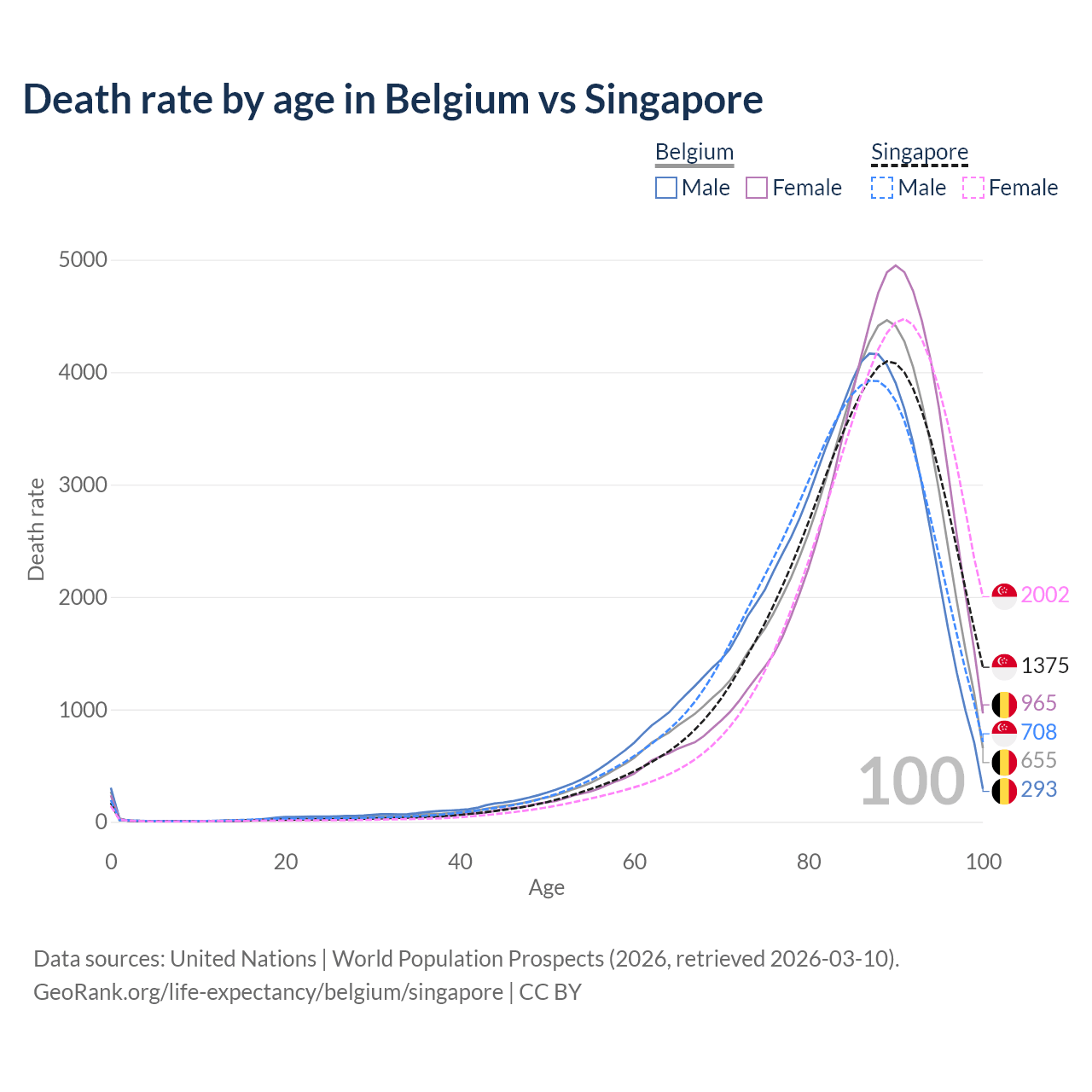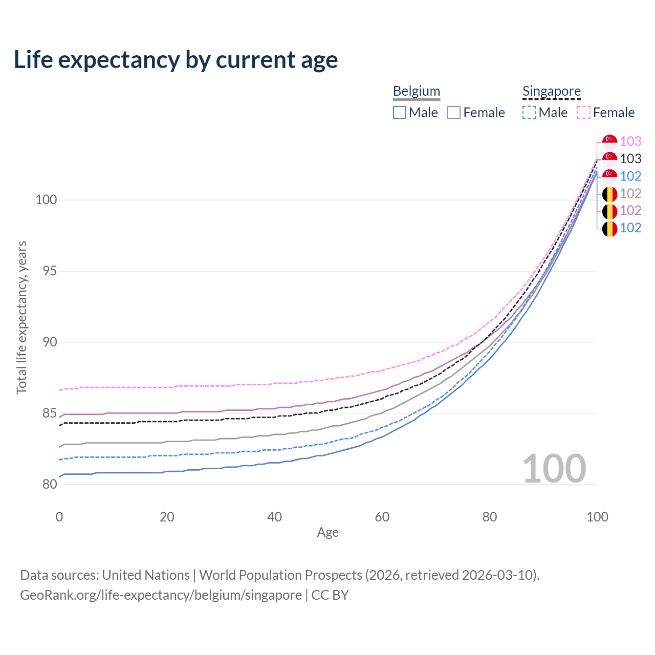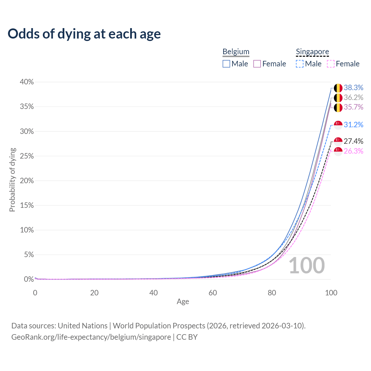 This life expectancy calculator shows the odds of living to 100, 95, 90, and below based on current age for both males and females in Belgium and Singapore, along with mean and median age of death. The calculations are based on the 2026 life tables (actuarial tables) from the UN World Population Prospects.