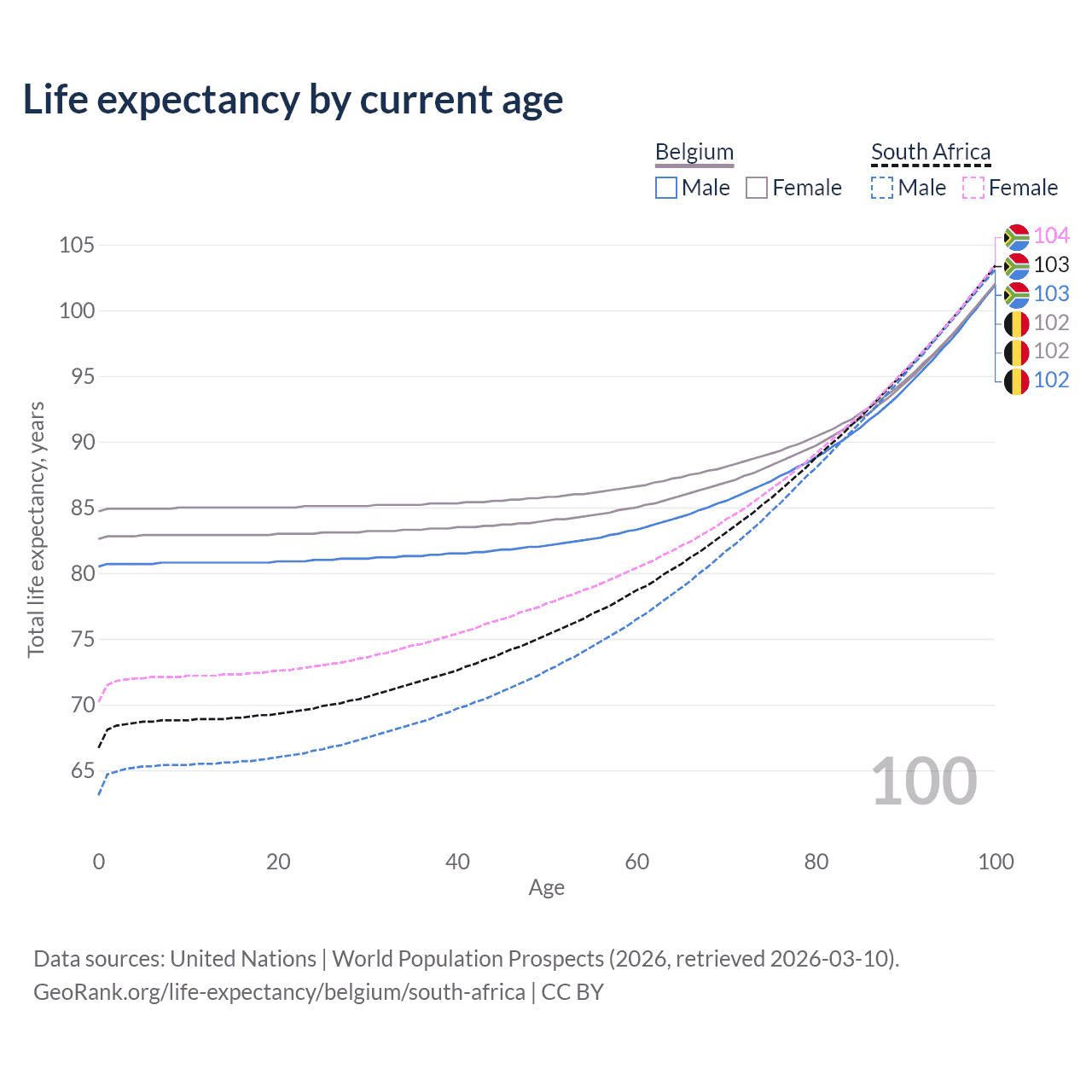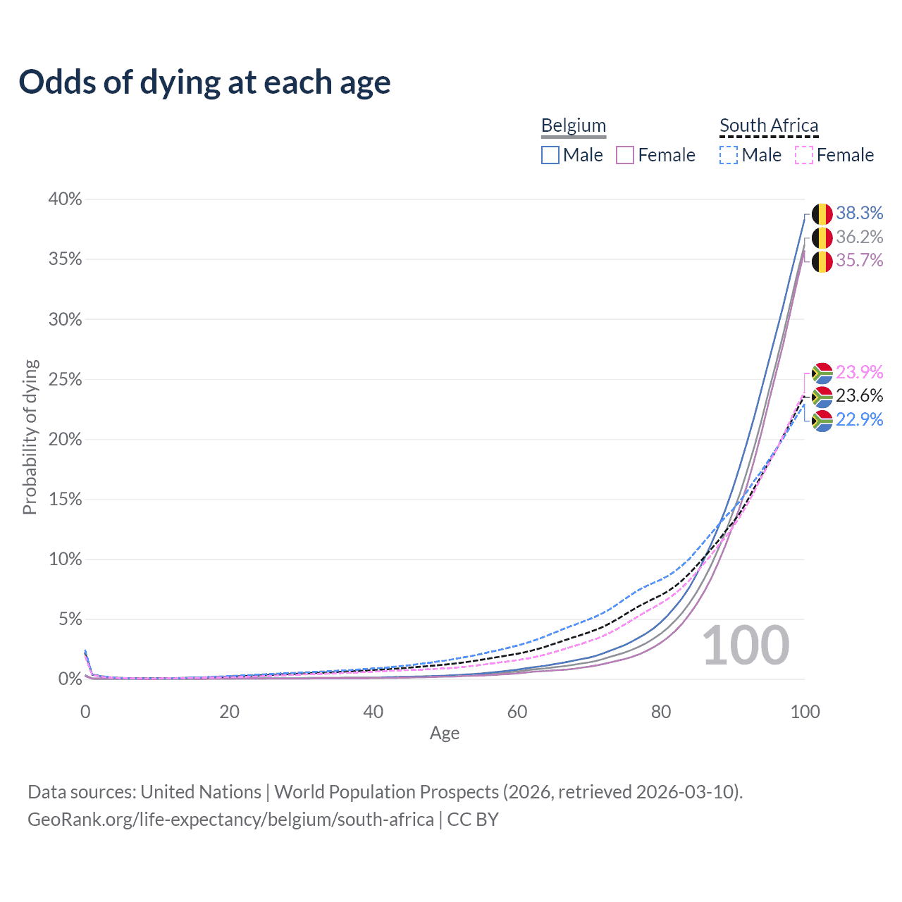 This life expectancy calculator shows the odds of living to 100, 95, 90, and below based on current age for both males and females in Belgium and South Africa, along with mean and median age of death. The calculations are based on the 2026 life tables (actuarial tables) from the UN World Population Prospects.