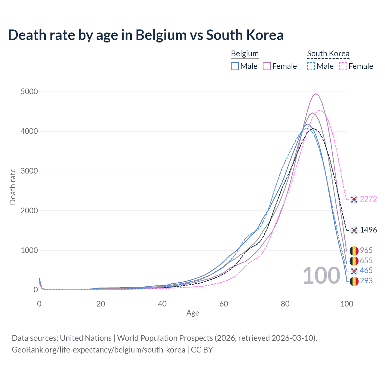 In Belgium, the most common age of death is 89, compared to 89 in South Korea. The median age of death is 85.8 in Belgium and 86.8 in South Korea, meaning only half of each cohort is expected to live past that age.