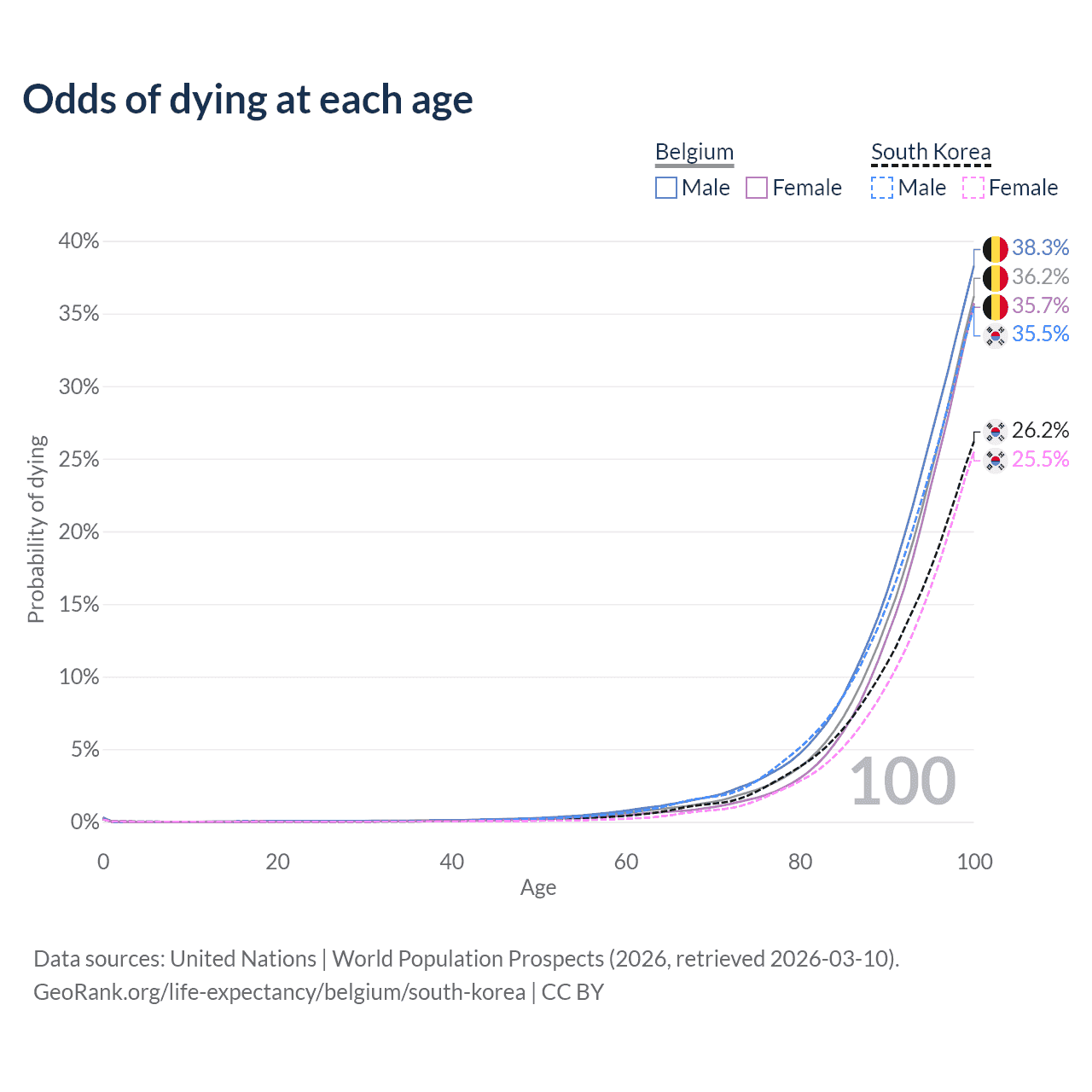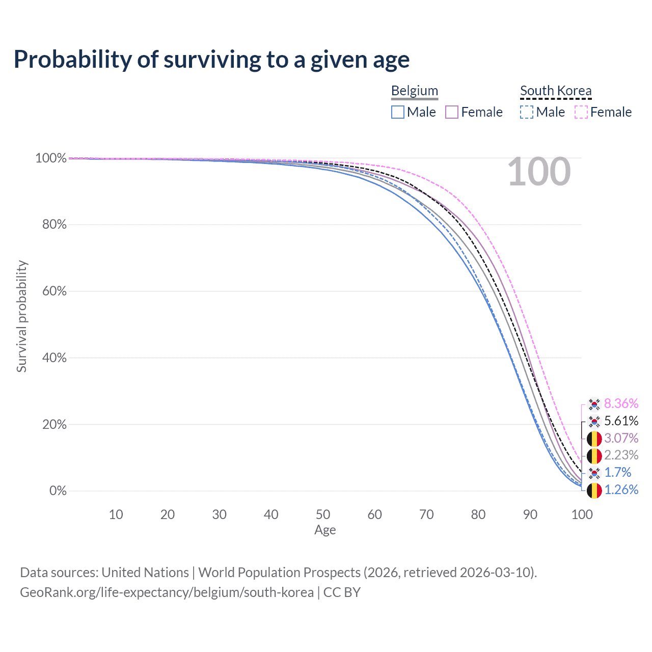 This life expectancy calculator shows the odds of living to 100, 95, 90, and below based on current age for both males and females in Belgium and South Korea, along with mean and median age of death. The calculations are based on the 2026 life tables (actuarial tables) from the UN World Population Prospects.