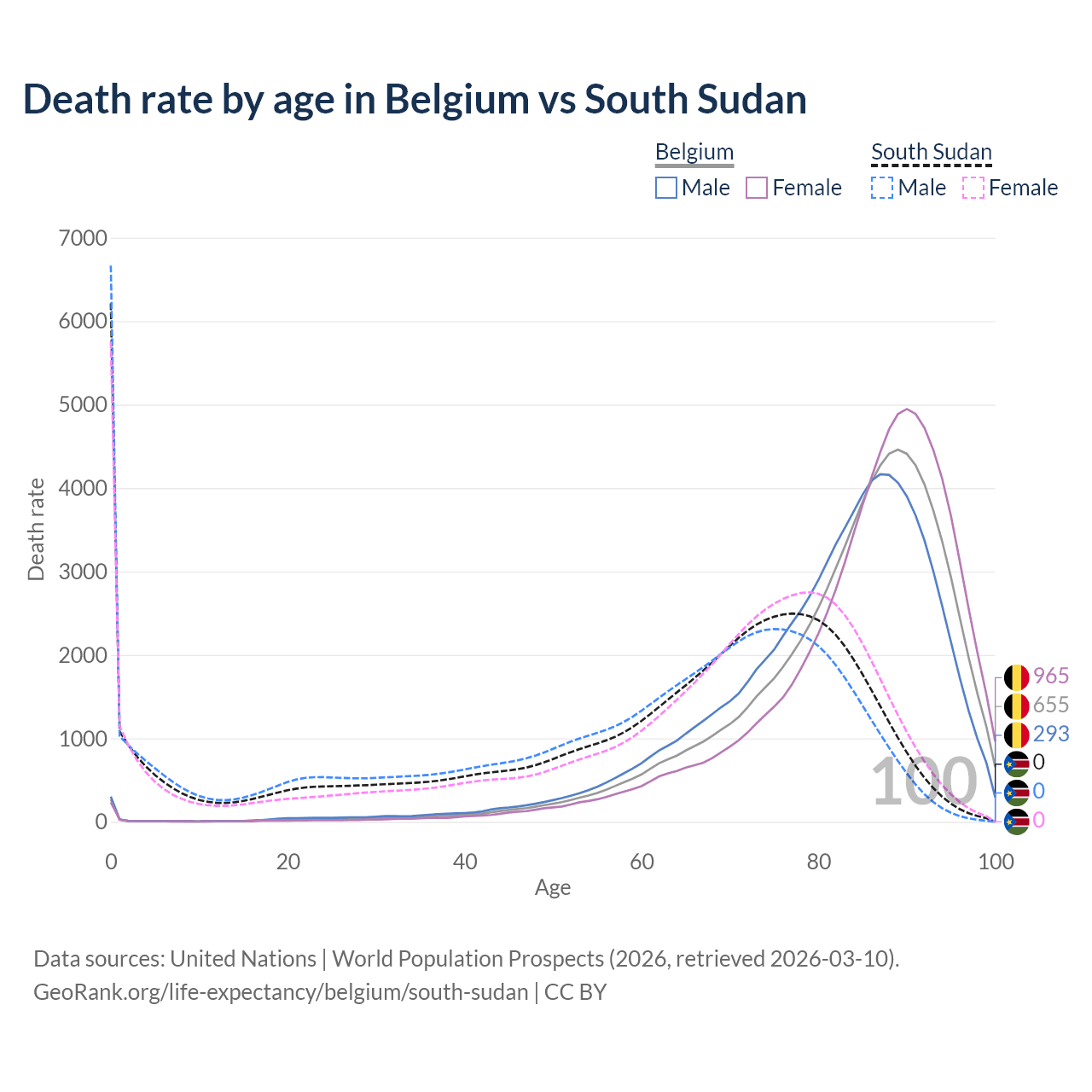 The average life expectancy at birth is 82.6 years in Belgium vs 58 in South Sudan. Belgium is ranked 26/197 by life expectancy, and South Sudan is 195/197. In Belgium, the life expectancy is 80.5 years for males and 84.7 years for females. In South Sudan, it's 55 years for males and 61 years for females.