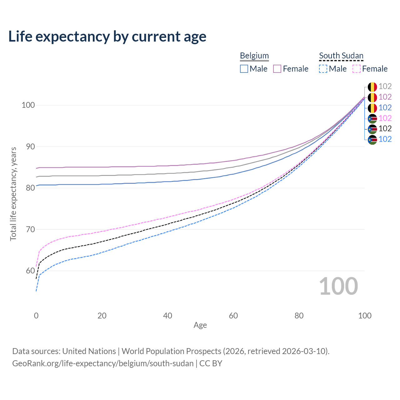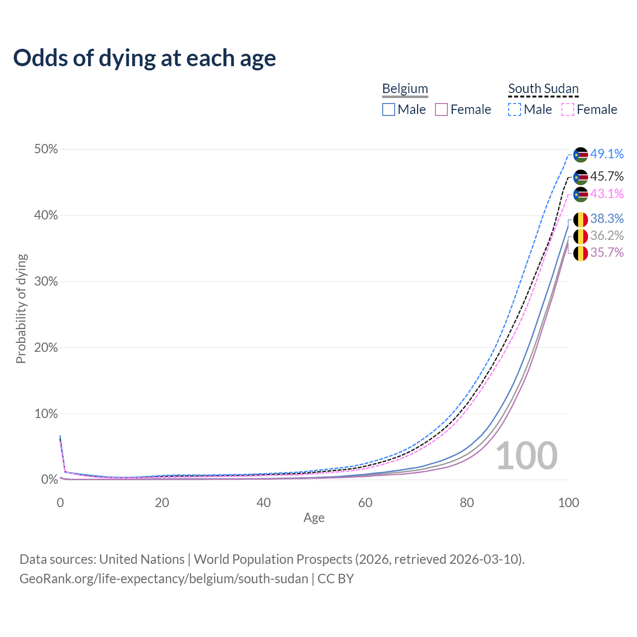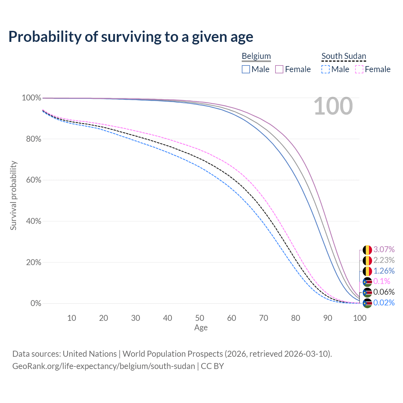 This life expectancy calculator shows the odds of living to 100, 95, 90, and below based on current age for both males and females in Belgium and South Sudan, along with mean and median age of death. The calculations are based on the 2026 life tables (actuarial tables) from the UN World Population Prospects.