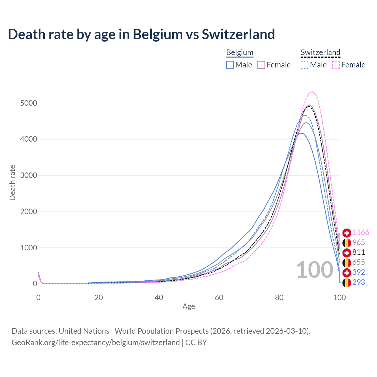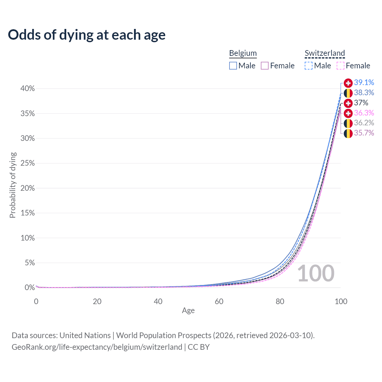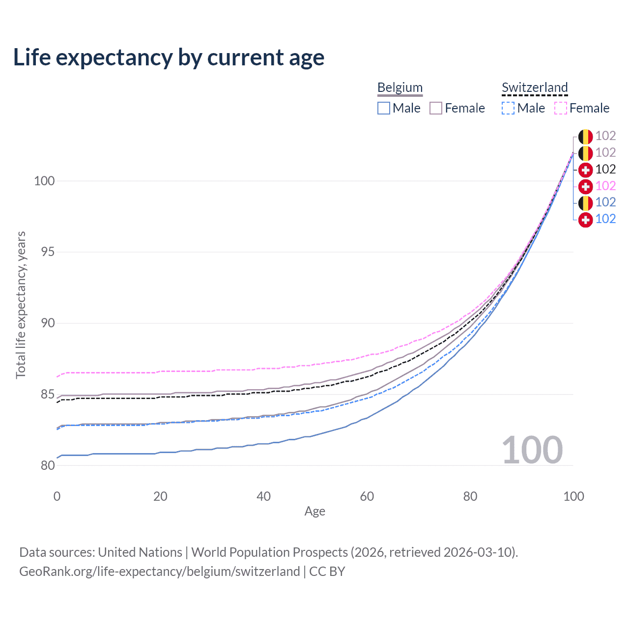 This life expectancy calculator shows the odds of living to 100, 95, 90, and below based on current age for both males and females in Belgium and Switzerland, along with mean and median age of death. The calculations are based on the 2026 life tables (actuarial tables) from the UN World Population Prospects.