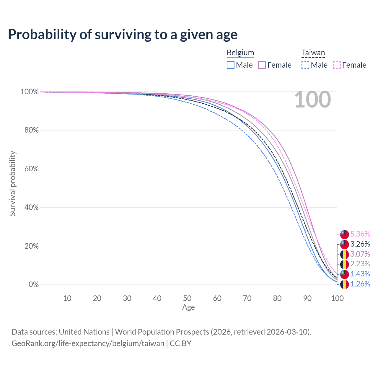 This life expectancy calculator shows the odds of living to 100, 95, 90, and below based on current age for both males and females in Belgium and Taiwan, along with mean and median age of death. The calculations are based on the 2026 life tables (actuarial tables) from the UN World Population Prospects.
