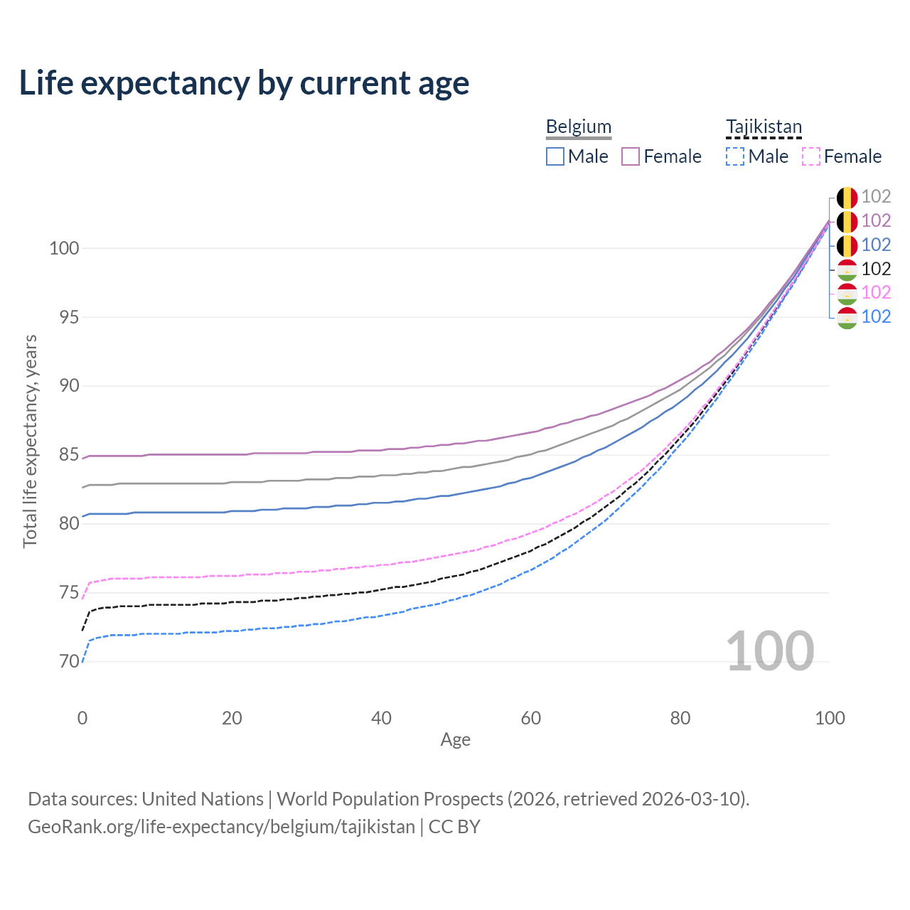 This life expectancy calculator shows the odds of living to 100, 95, 90, and below based on current age for both males and females in Belgium and Tajikistan, along with mean and median age of death. The calculations are based on the 2026 life tables (actuarial tables) from the UN World Population Prospects.