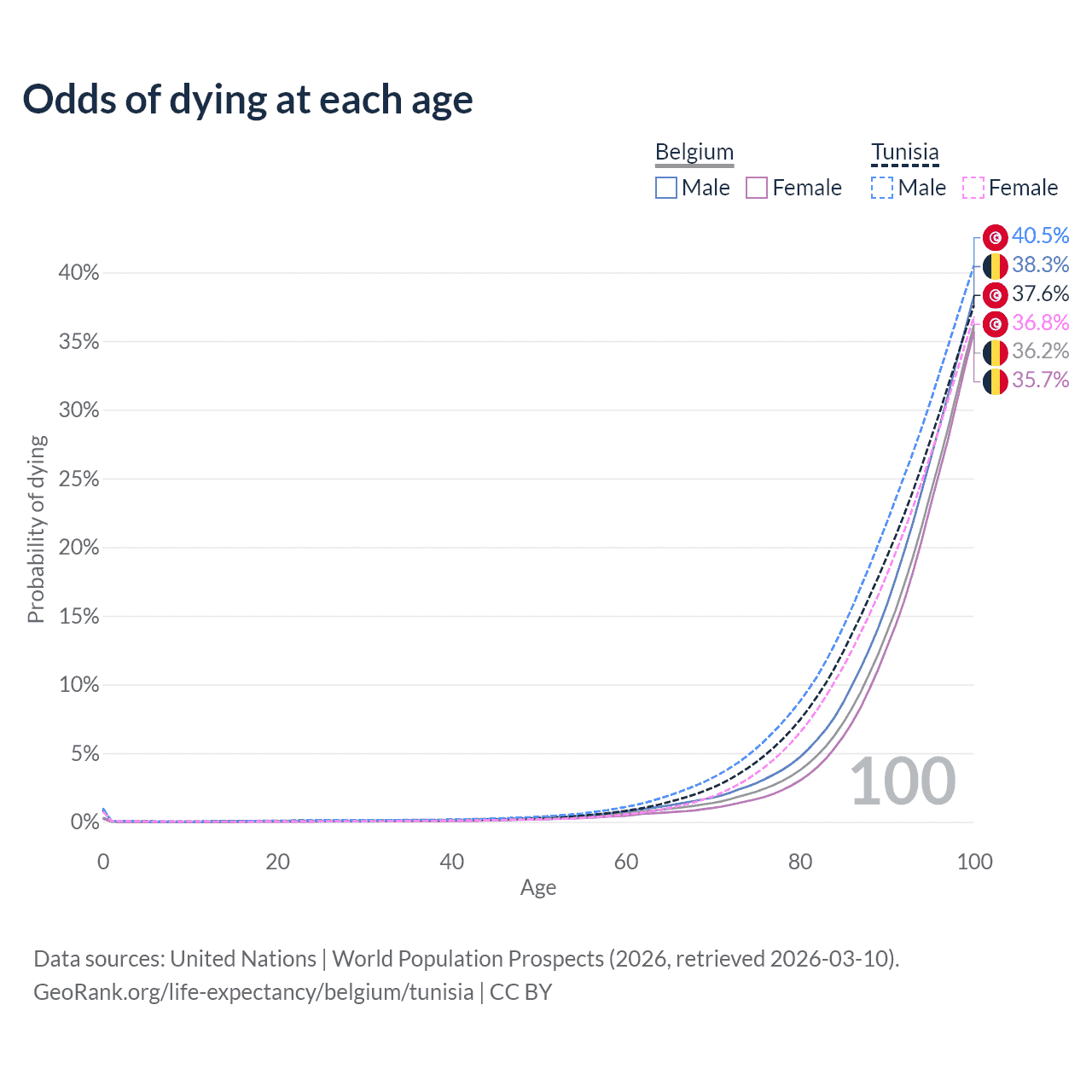 This life expectancy calculator shows the odds of living to 100, 95, 90, and below based on current age for both males and females in Belgium and Tunisia, along with mean and median age of death. The calculations are based on the 2026 life tables (actuarial tables) from the UN World Population Prospects.