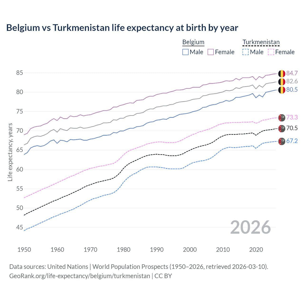 The average life expectancy at birth is 82.6 years in Belgium vs 70.5 in Turkmenistan. Belgium is ranked 26/197 by life expectancy, and Turkmenistan is 135/197. In Belgium, the life expectancy is 80.5 years for males and 84.7 years for females. In Turkmenistan, it's 67.2 years for males and 73.3 years for females.