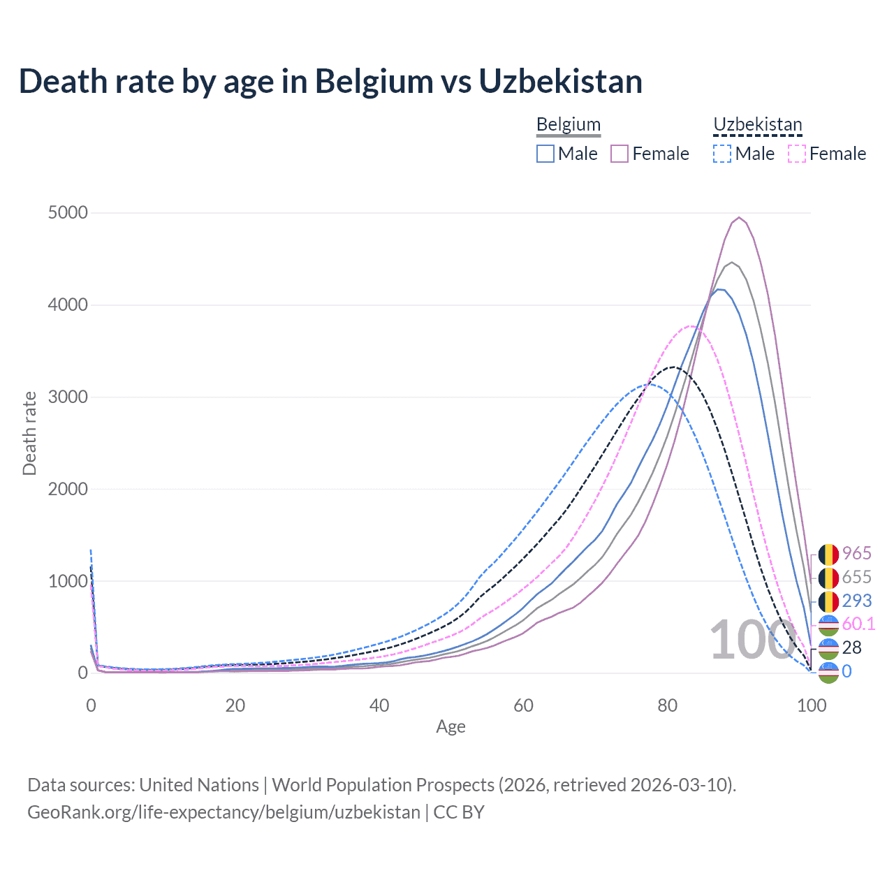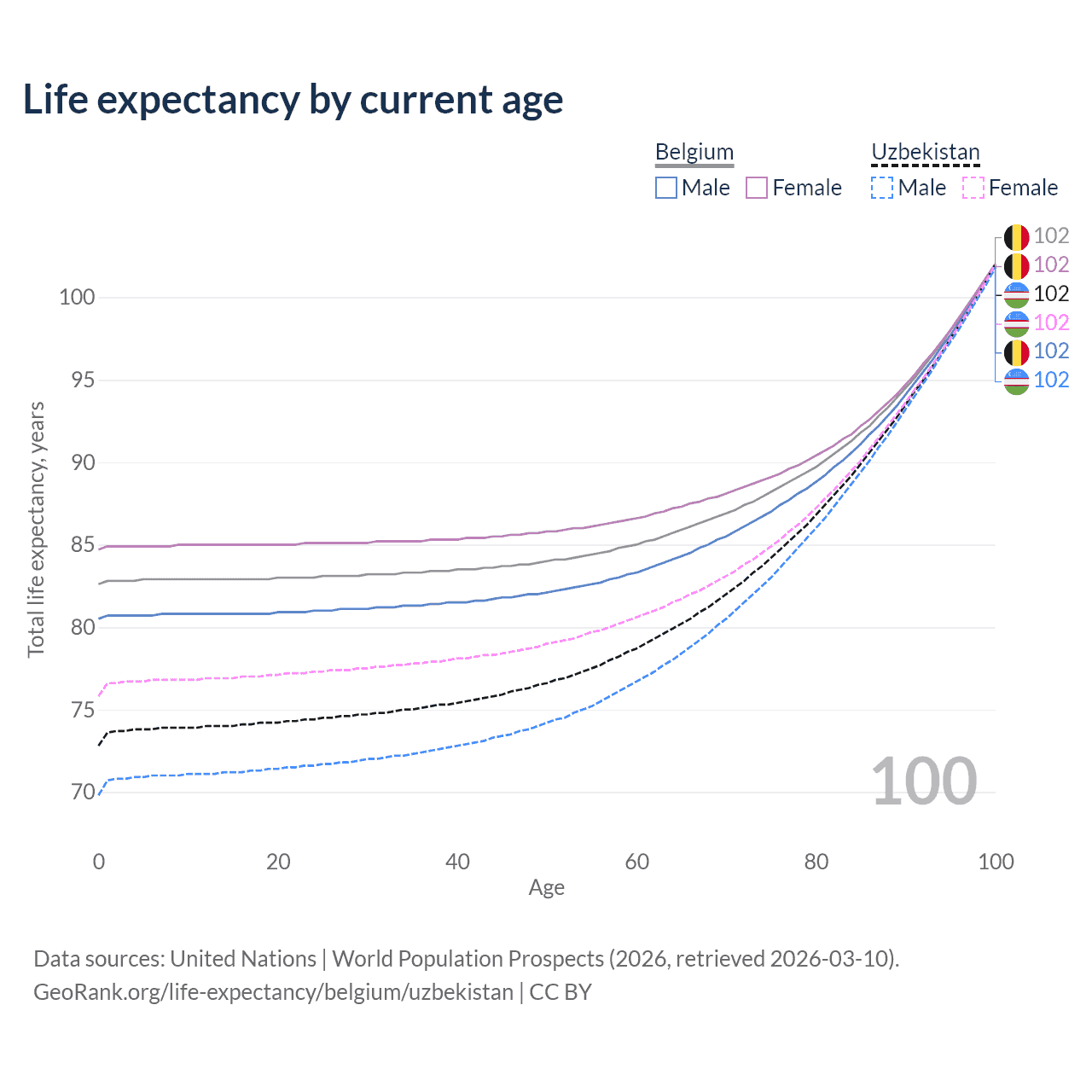 This life expectancy calculator shows the odds of living to 100, 95, 90, and below based on current age for both males and females in Belgium and Uzbekistan, along with mean and median age of death. The calculations are based on the 2026 life tables (actuarial tables) from the UN World Population Prospects.