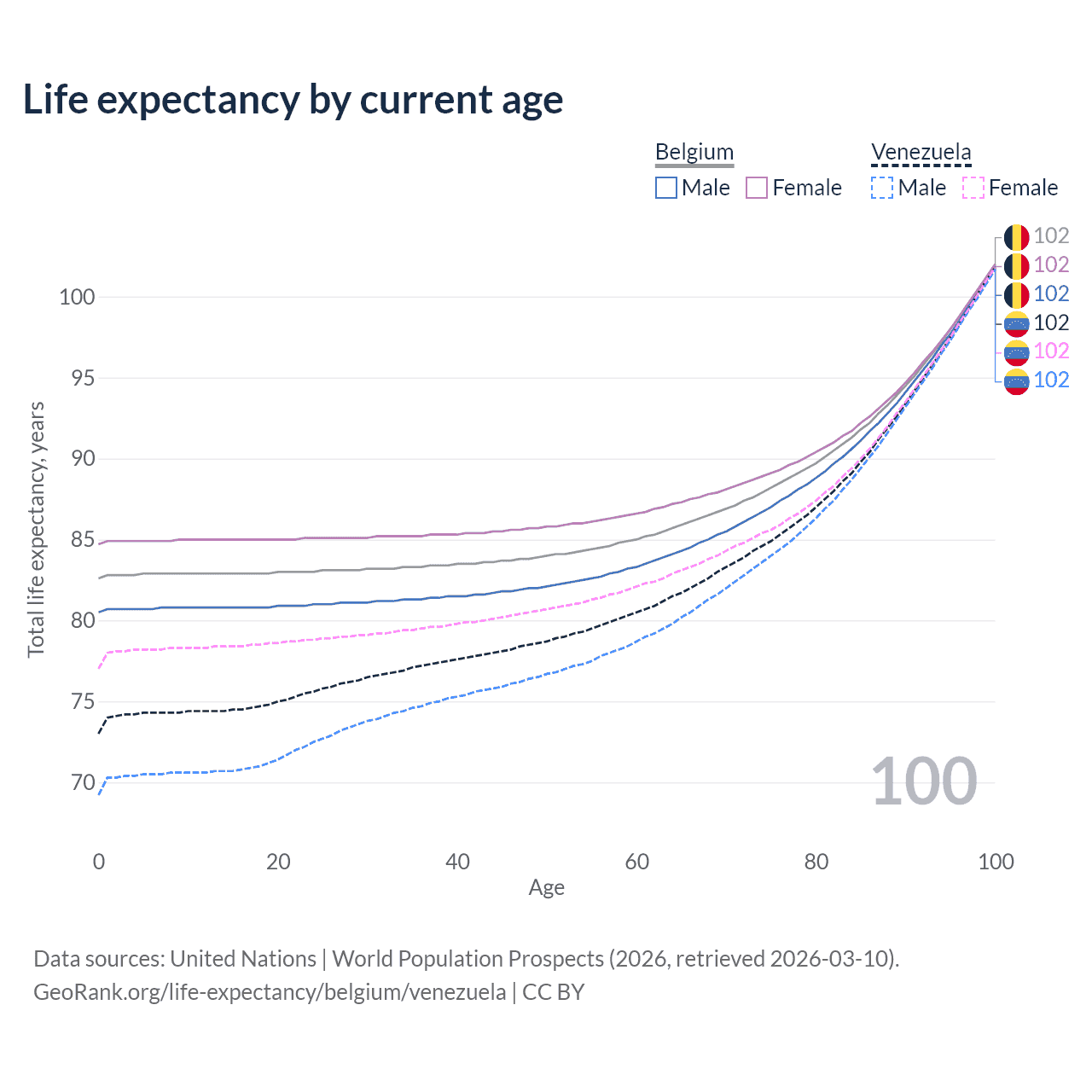 This life expectancy calculator shows the odds of living to 100, 95, 90, and below based on current age for both males and females in Belgium and Venezuela, along with mean and median age of death. The calculations are based on the 2026 life tables (actuarial tables) from the UN World Population Prospects.