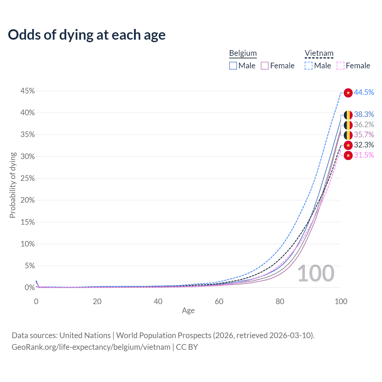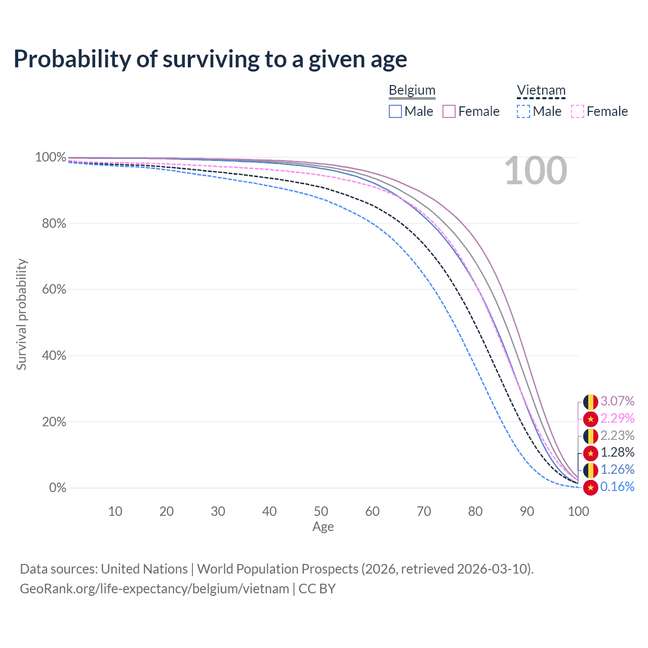 This life expectancy calculator shows the odds of living to 100, 95, 90, and below based on current age for both males and females in Belgium and Vietnam, along with mean and median age of death. The calculations are based on the 2026 life tables (actuarial tables) from the UN World Population Prospects.