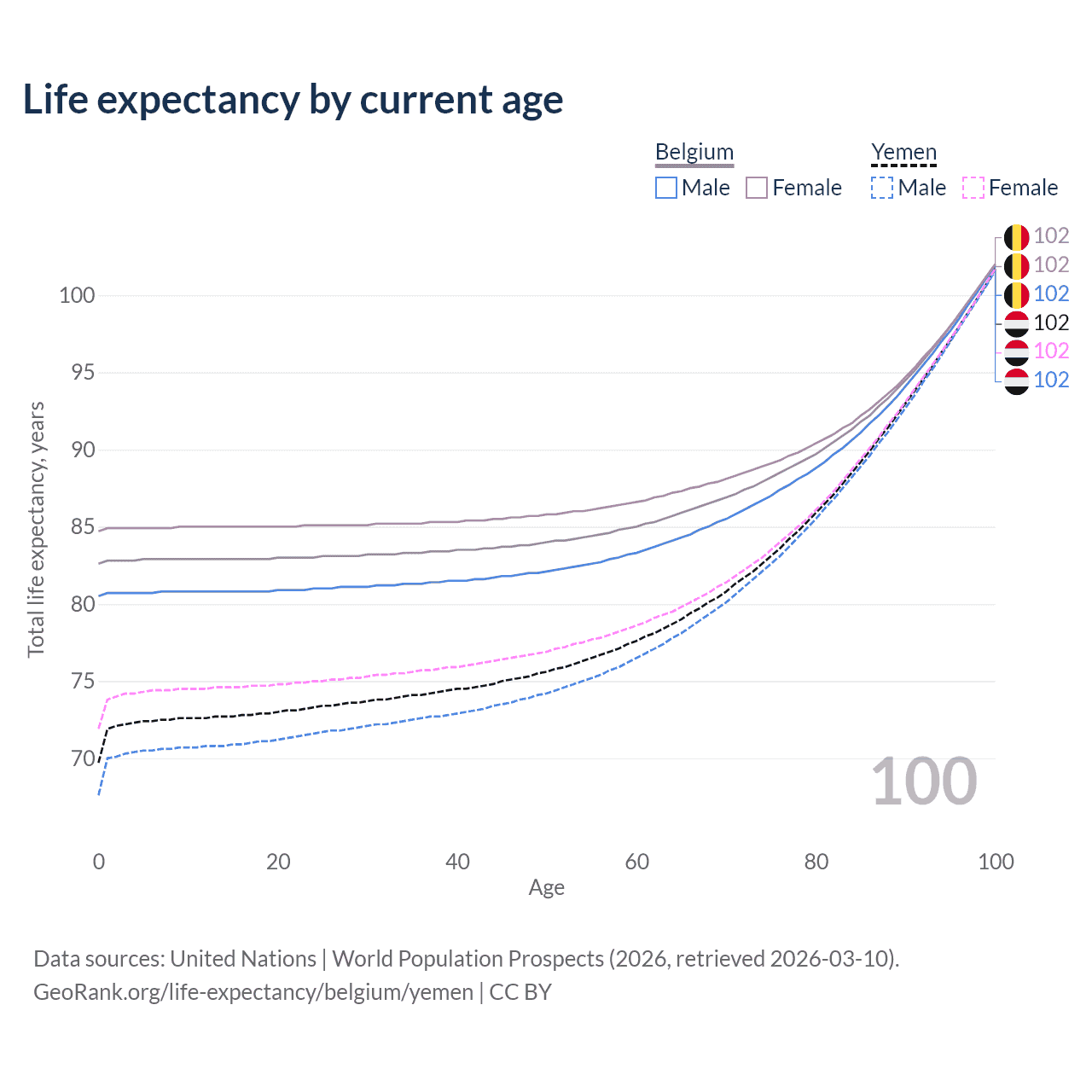 This life expectancy calculator shows the odds of living to 100, 95, 90, and below based on current age for both males and females in Belgium and Yemen, along with mean and median age of death. The calculations are based on the 2026 life tables (actuarial tables) from the UN World Population Prospects.
