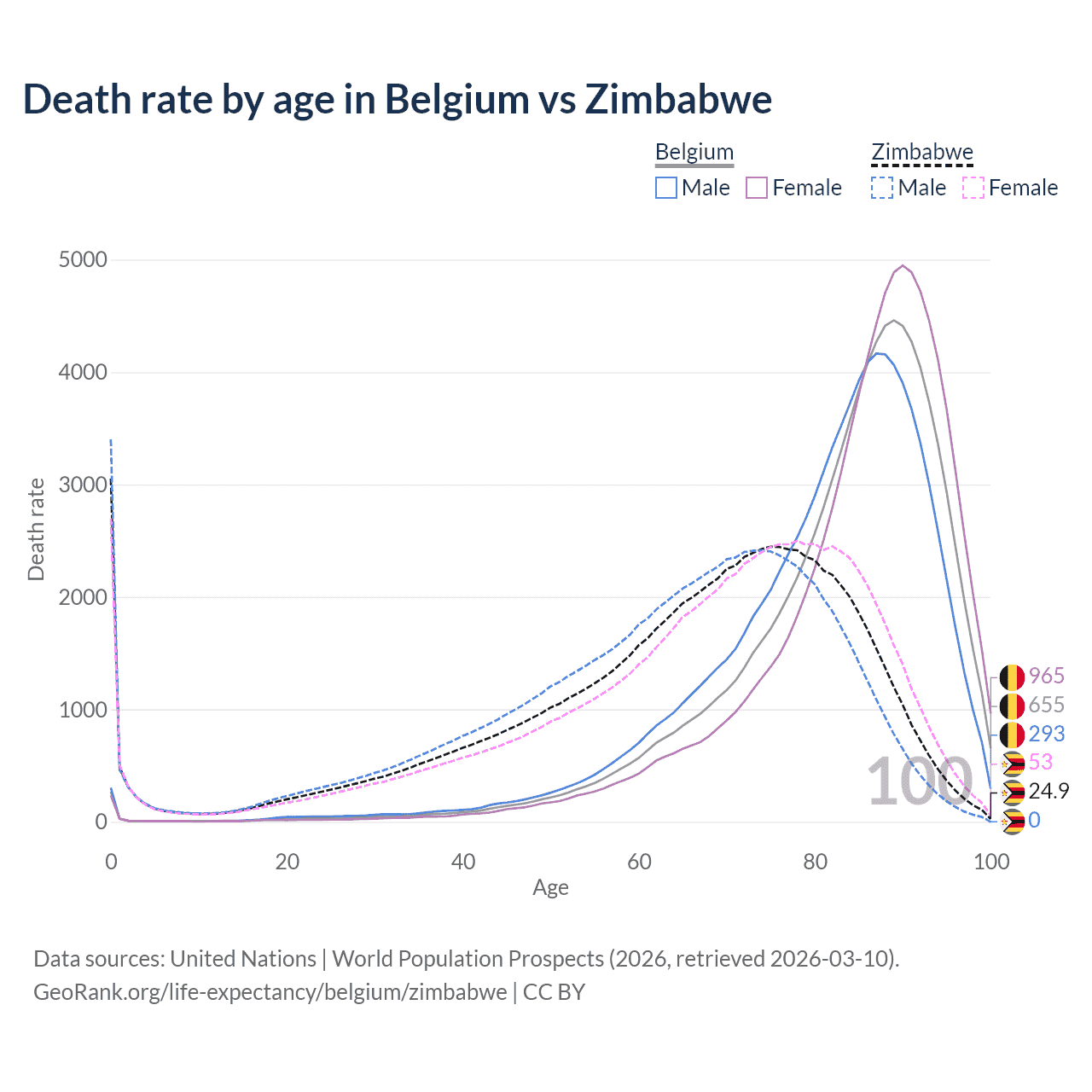 In Belgium, the most common age of death is 89, compared to 0 in Zimbabwe. The median age of death is 85.8 in Belgium and 68.8 in Zimbabwe, meaning only half of each cohort is expected to live past that age.