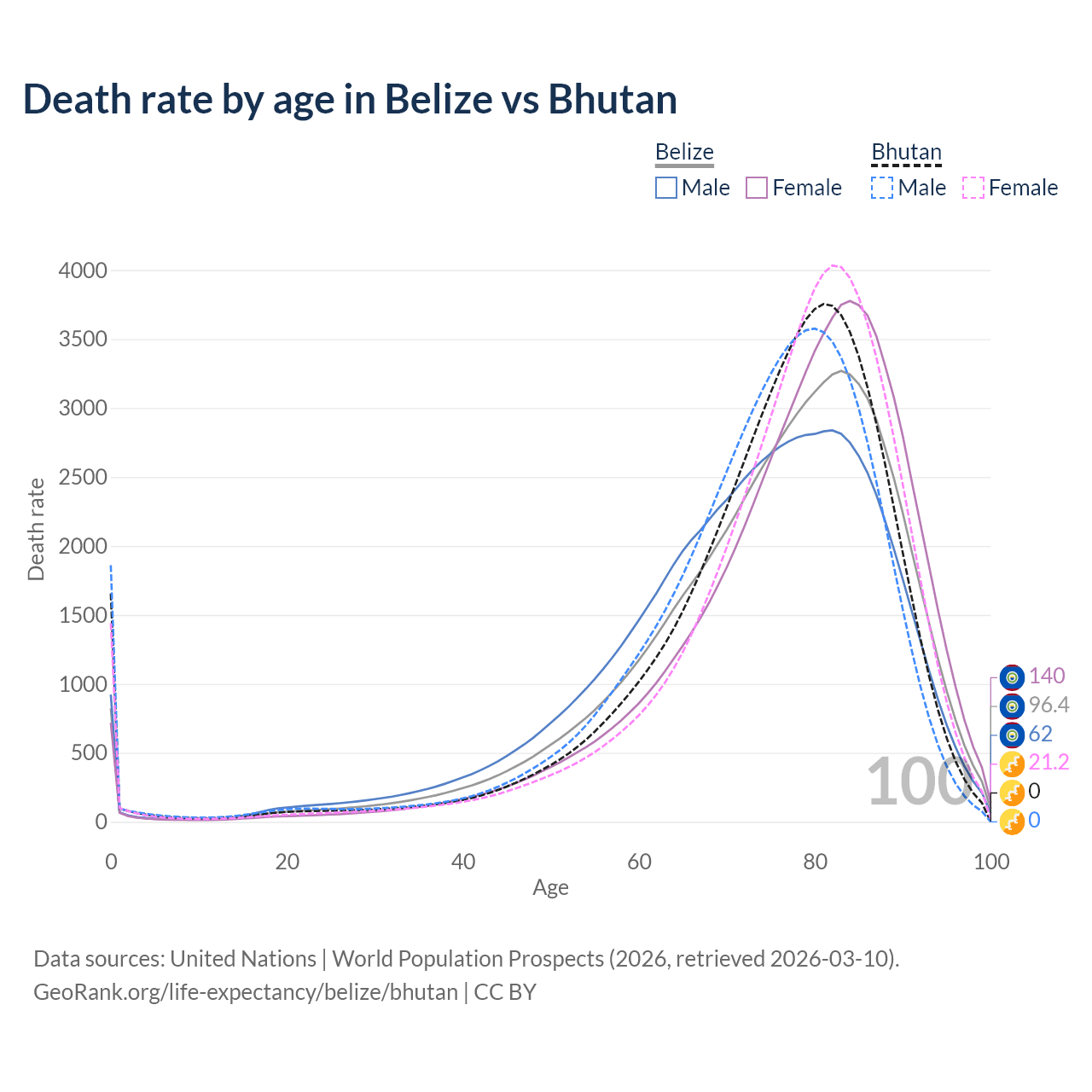 In Belize, the most common age of death is 83, compared to 81 in Bhutan. The median age of death is 77.5 in Belize and 77.6 in Bhutan, meaning only half of each cohort is expected to live past that age.
