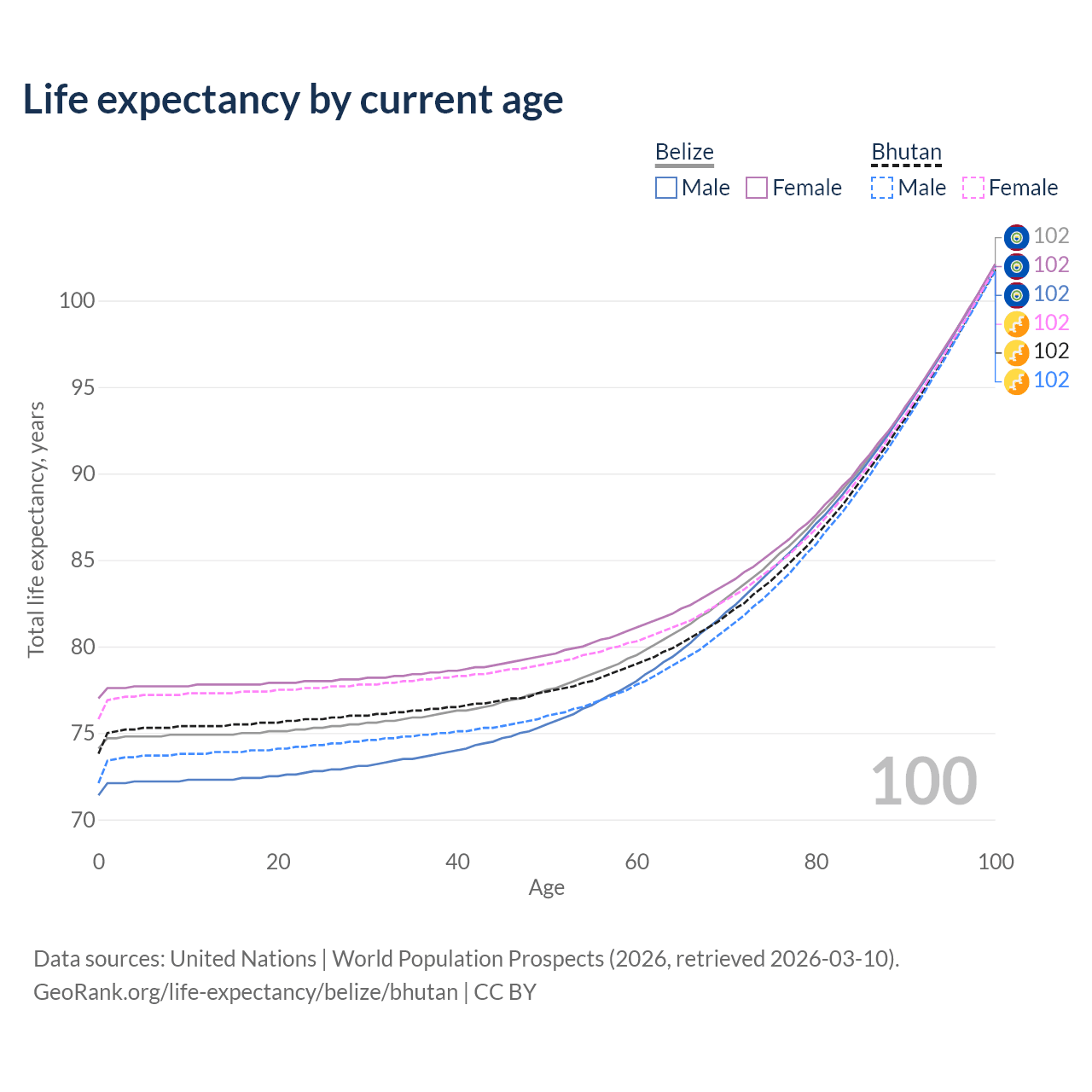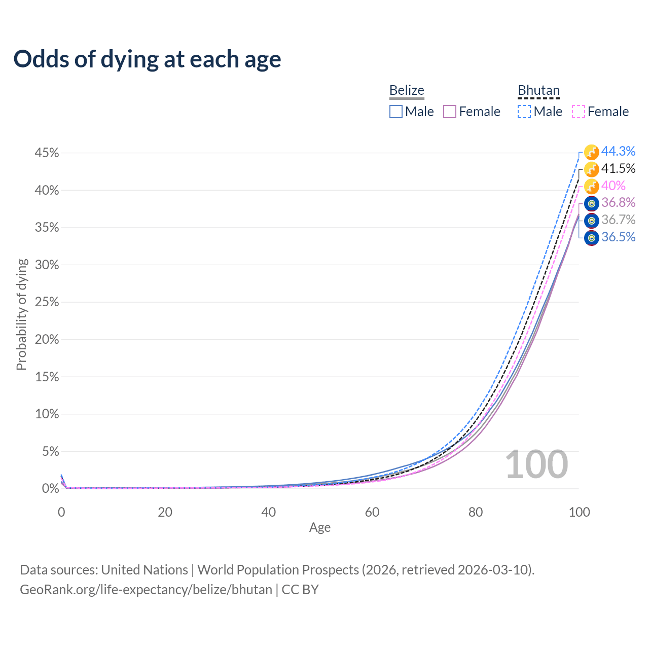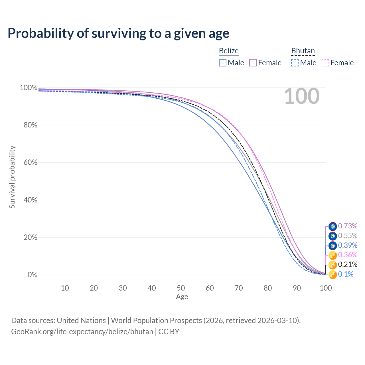 This life expectancy calculator shows the odds of living to 100, 95, 90, and below based on current age for both males and females in Belize and Bhutan, along with mean and median age of death. The calculations are based on the 2026 life tables (actuarial tables) from the UN World Population Prospects.