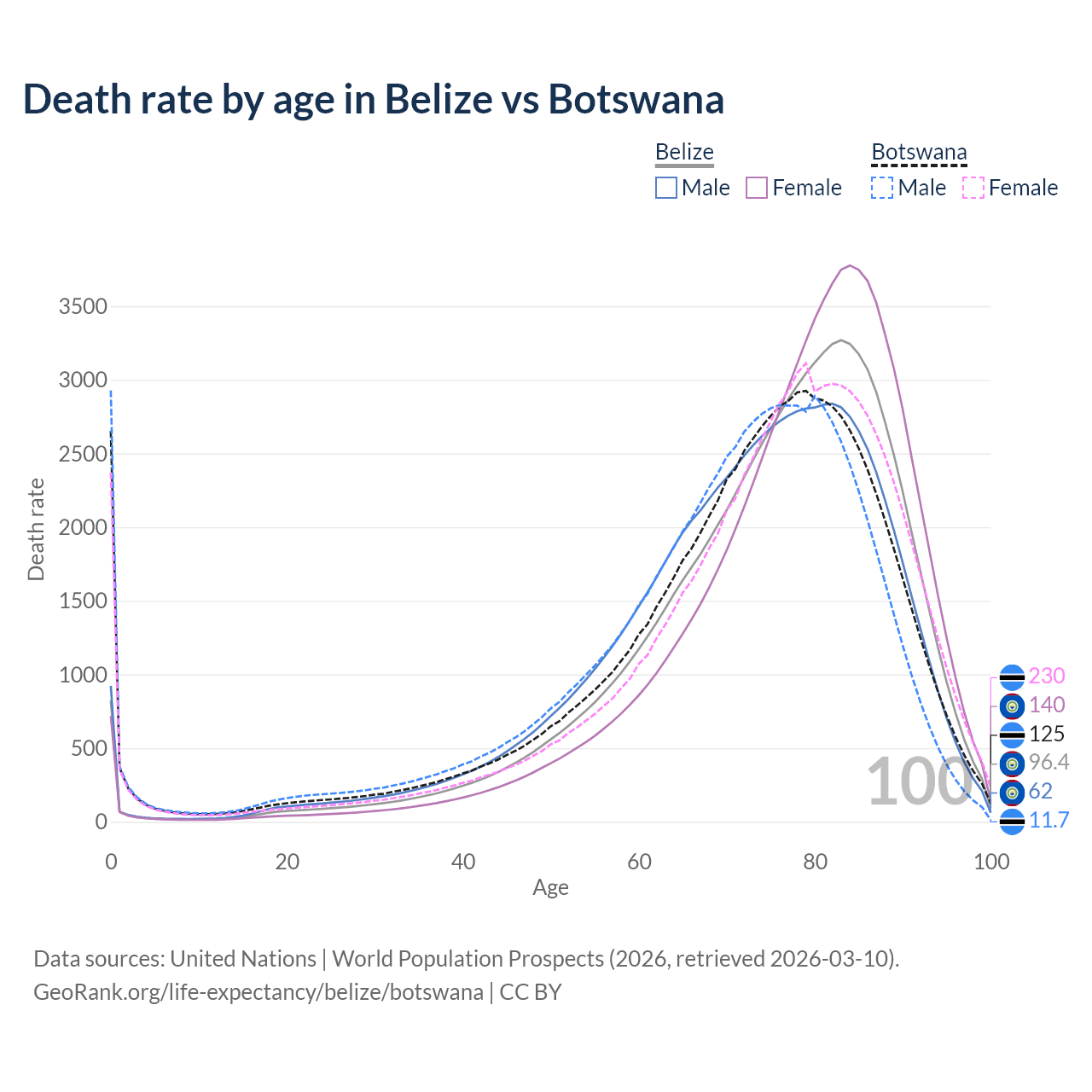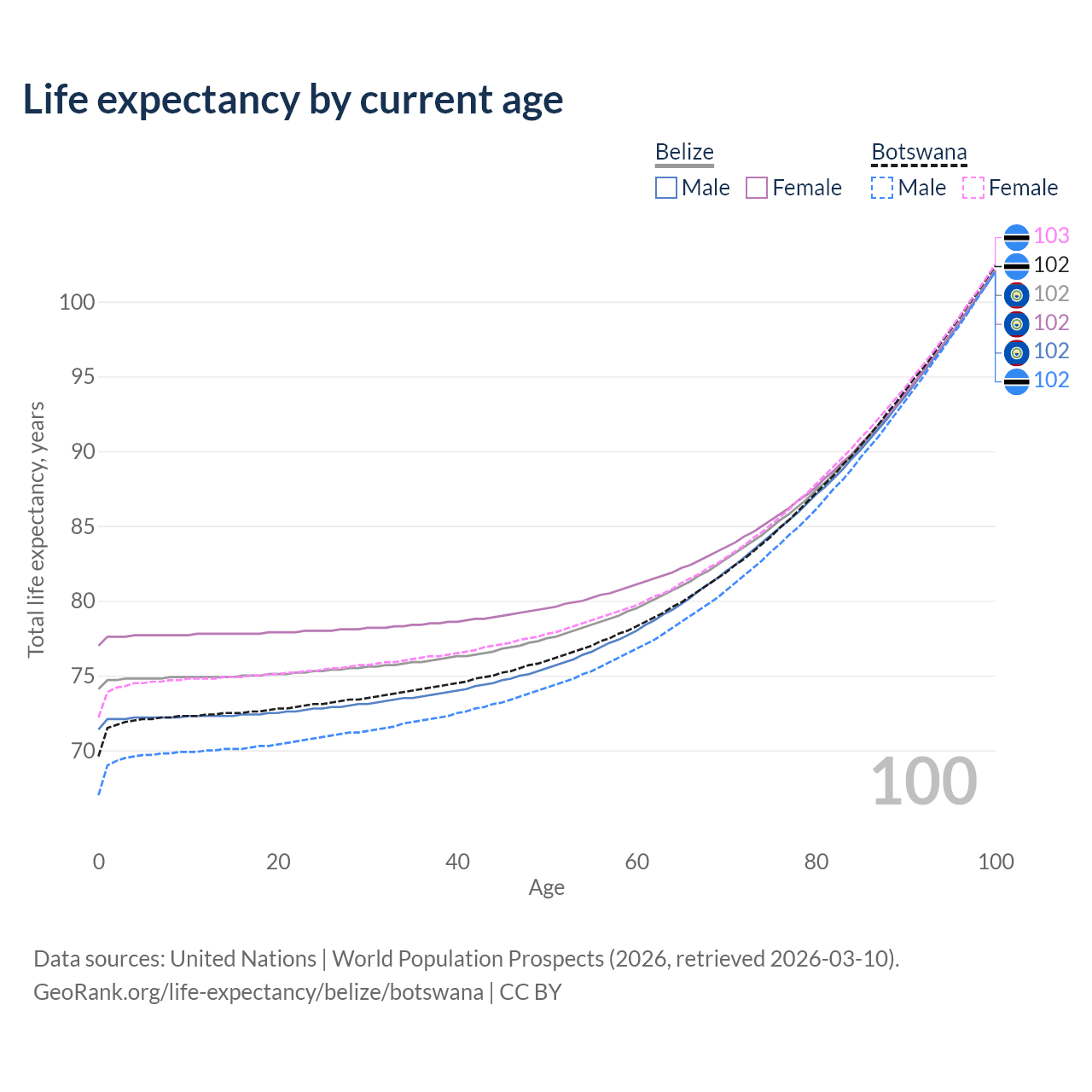 This life expectancy calculator shows the odds of living to 100, 95, 90, and below based on current age for both males and females in Belize and Botswana, along with mean and median age of death. The calculations are based on the 2026 life tables (actuarial tables) from the UN World Population Prospects.