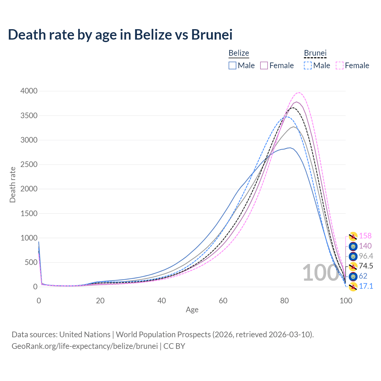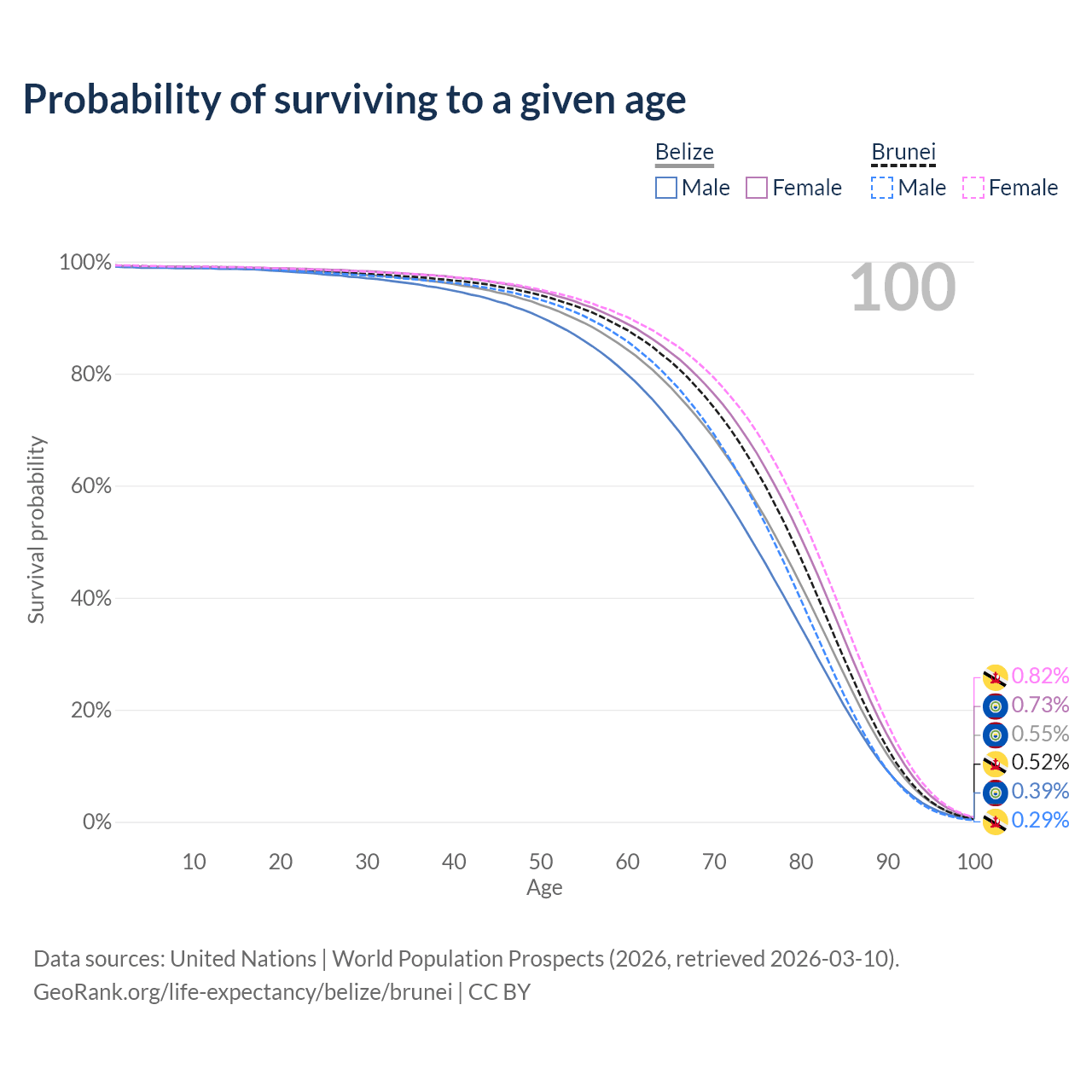 This life expectancy calculator shows the odds of living to 100, 95, 90, and below based on current age for both males and females in Belize and Brunei, along with mean and median age of death. The calculations are based on the 2026 life tables (actuarial tables) from the UN World Population Prospects.