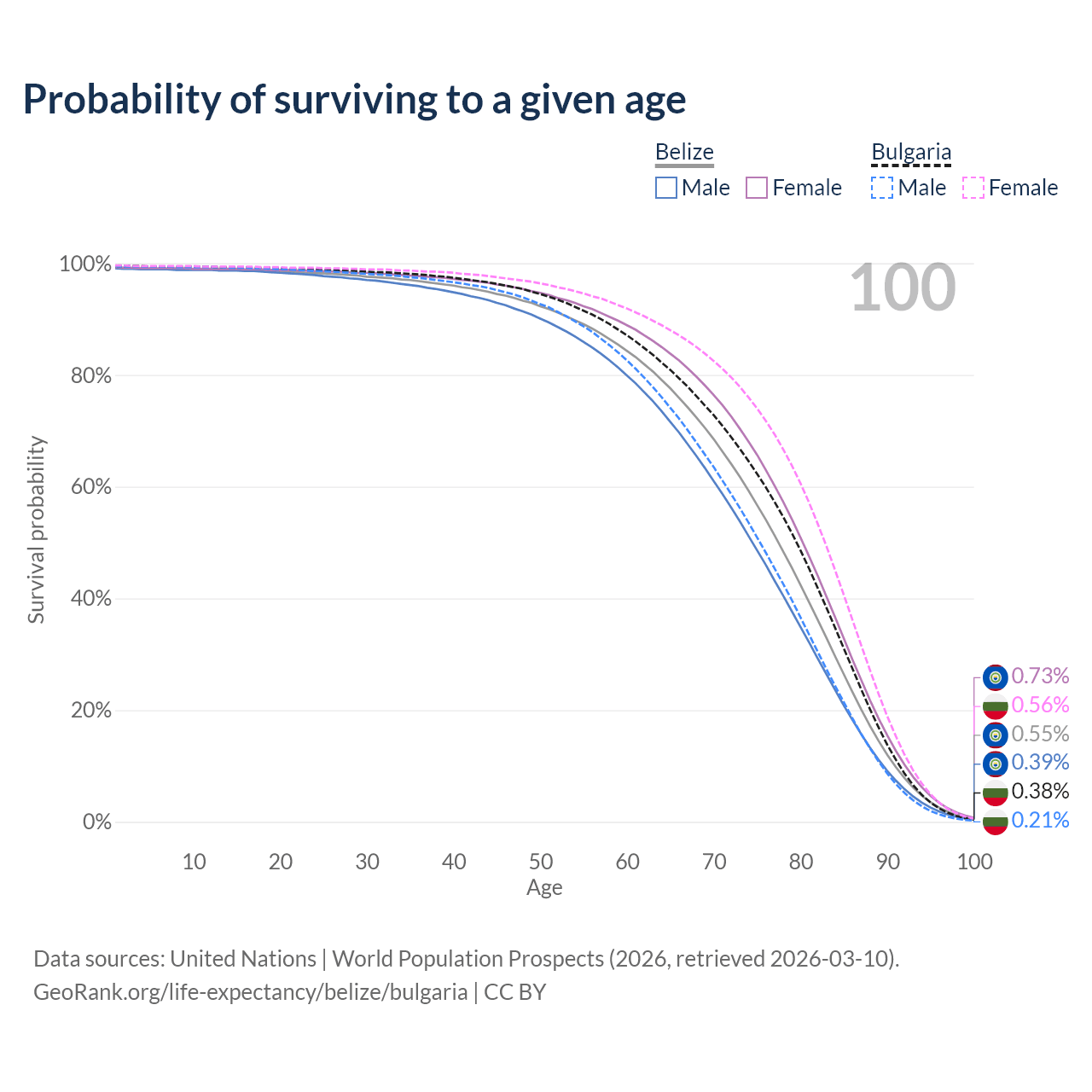 This life expectancy calculator shows the odds of living to 100, 95, 90, and below based on current age for both males and females in Belize and Bulgaria, along with mean and median age of death. The calculations are based on the 2026 life tables (actuarial tables) from the UN World Population Prospects.