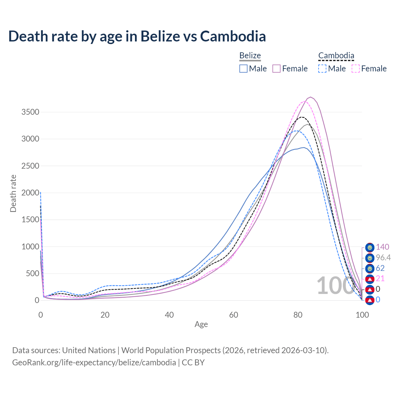 In Belize, the most common age of death is 83, compared to 81 in Cambodia. The median age of death is 77.5 in Belize and 76.5 in Cambodia, meaning only half of each cohort is expected to live past that age.