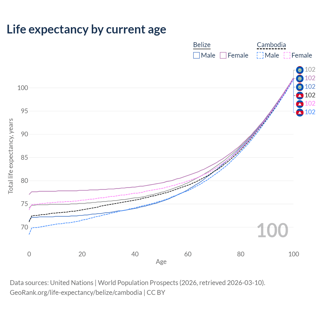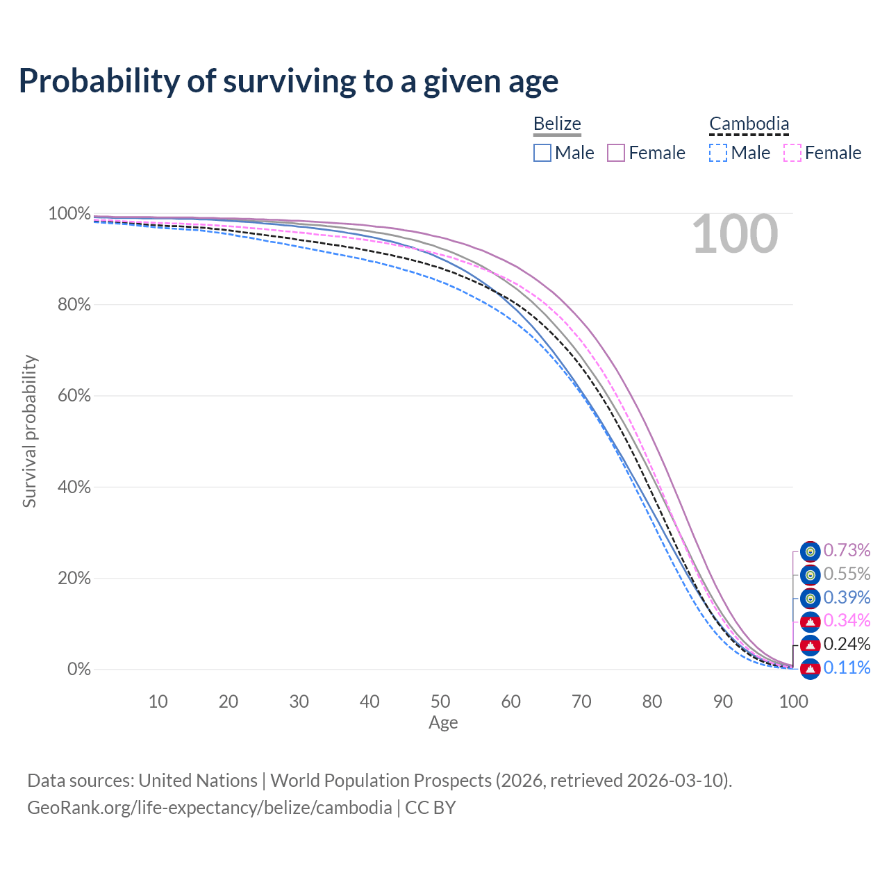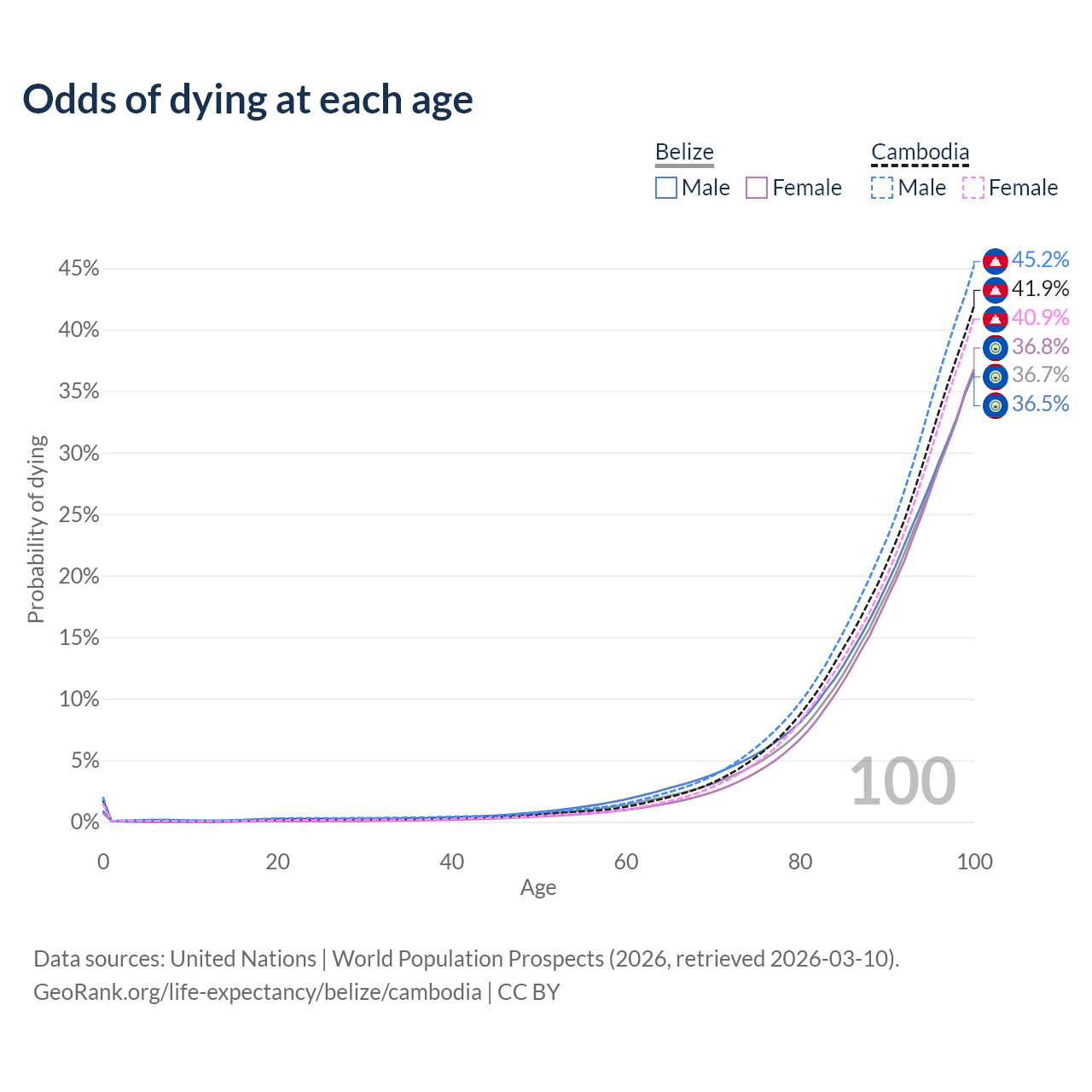 This life expectancy calculator shows the odds of living to 100, 95, 90, and below based on current age for both males and females in Belize and Cambodia, along with mean and median age of death. The calculations are based on the 2026 life tables (actuarial tables) from the UN World Population Prospects.