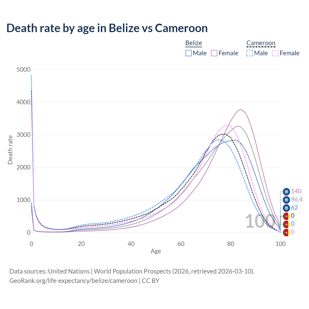 In Belize, the most common age of death is 83, compared to 0 in Cameroon. The median age of death is 77.5 in Belize and 71.6 in Cameroon, meaning only half of each cohort is expected to live past that age.