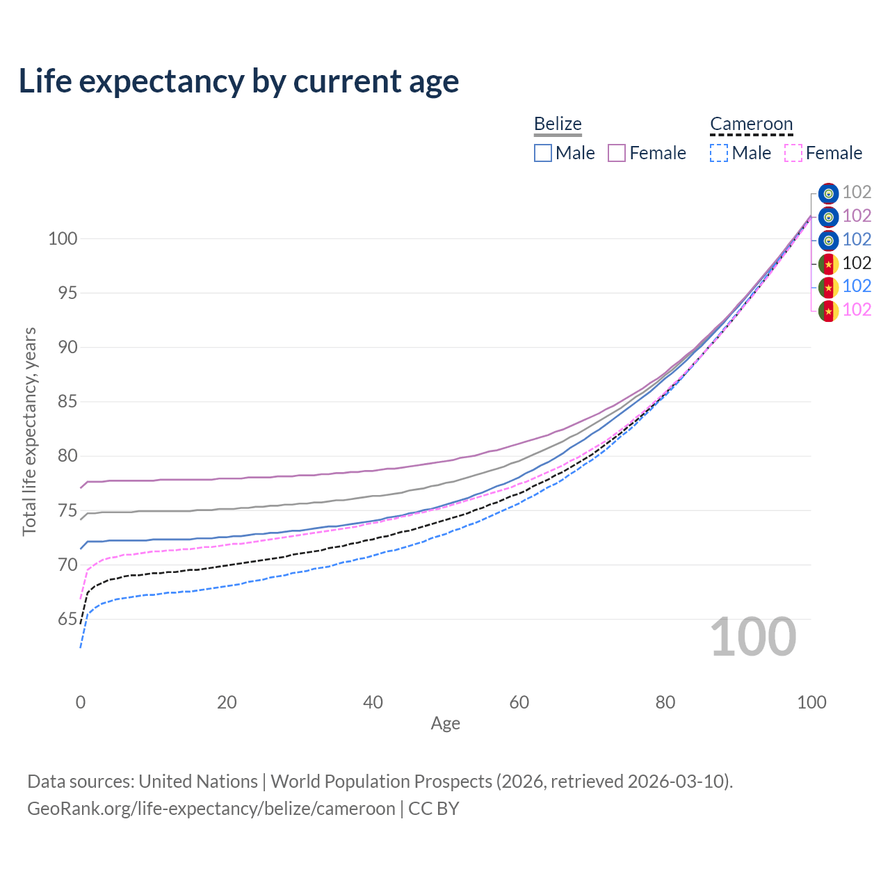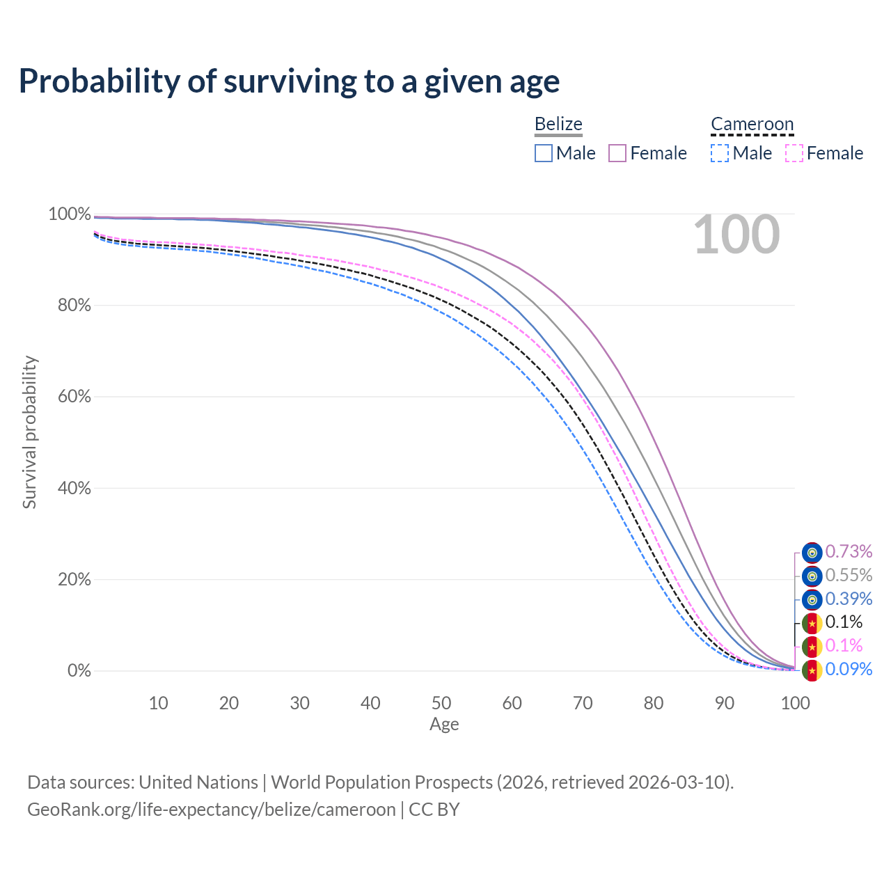 This life expectancy calculator shows the odds of living to 100, 95, 90, and below based on current age for both males and females in Belize and Cameroon, along with mean and median age of death. The calculations are based on the 2026 life tables (actuarial tables) from the UN World Population Prospects.