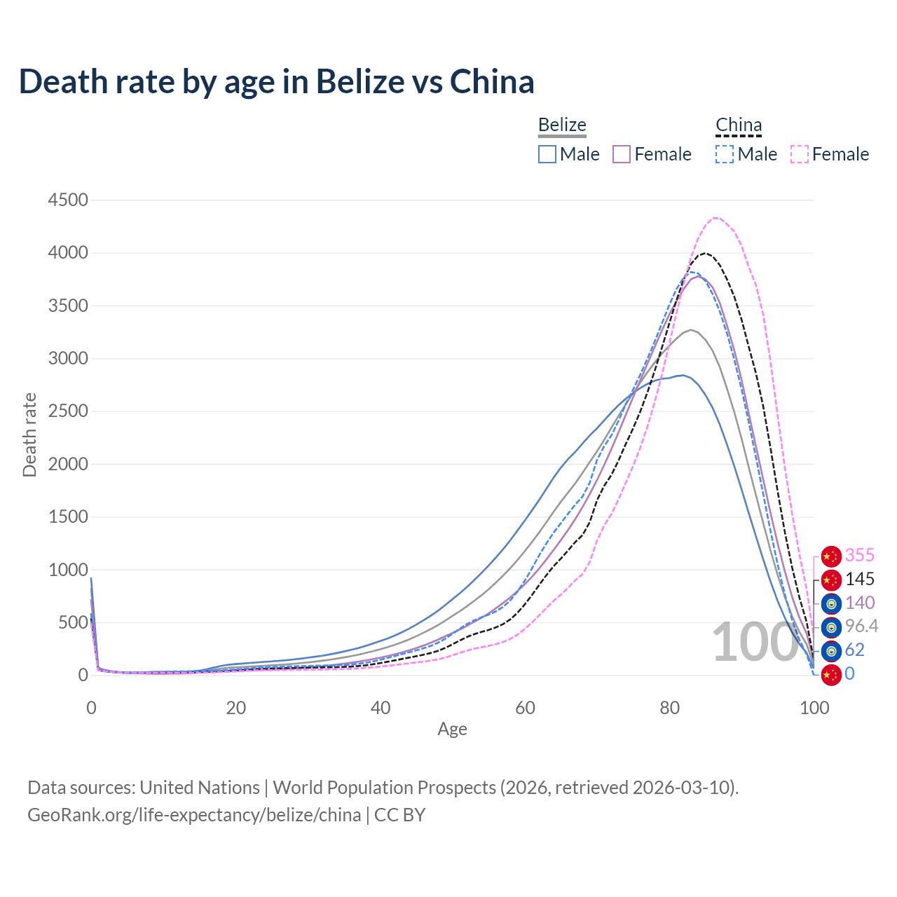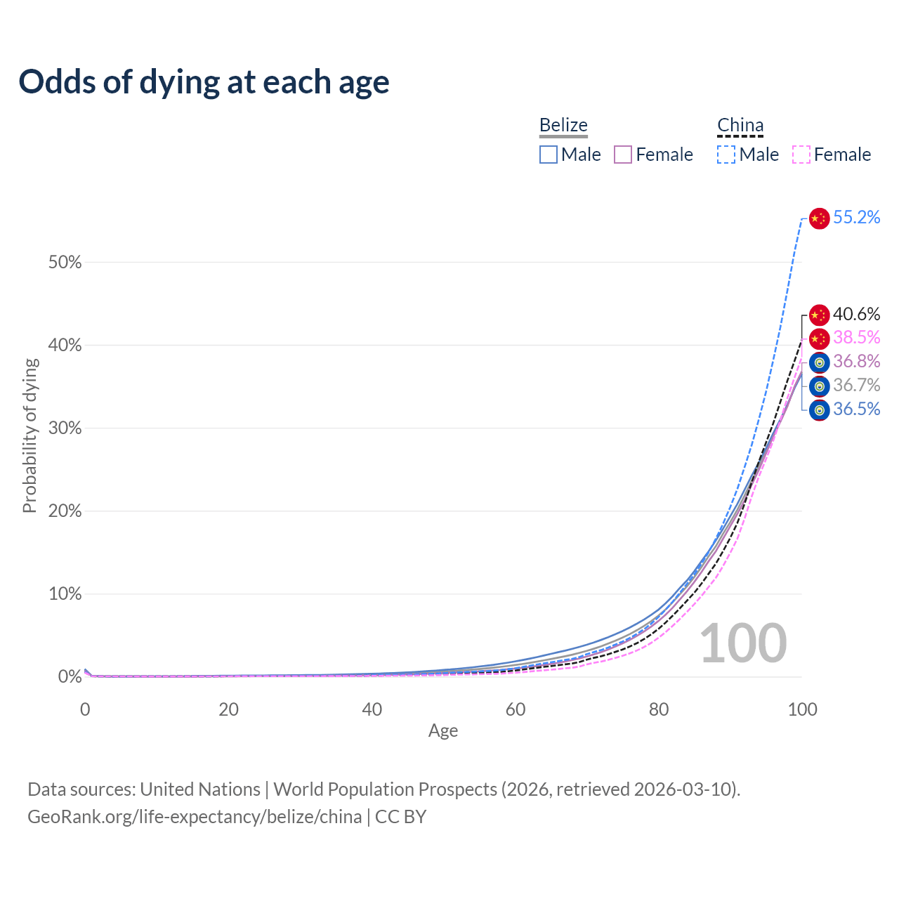 This life expectancy calculator shows the odds of living to 100, 95, 90, and below based on current age for both males and females in Belize and China, along with mean and median age of death. The calculations are based on the 2026 life tables (actuarial tables) from the UN World Population Prospects.