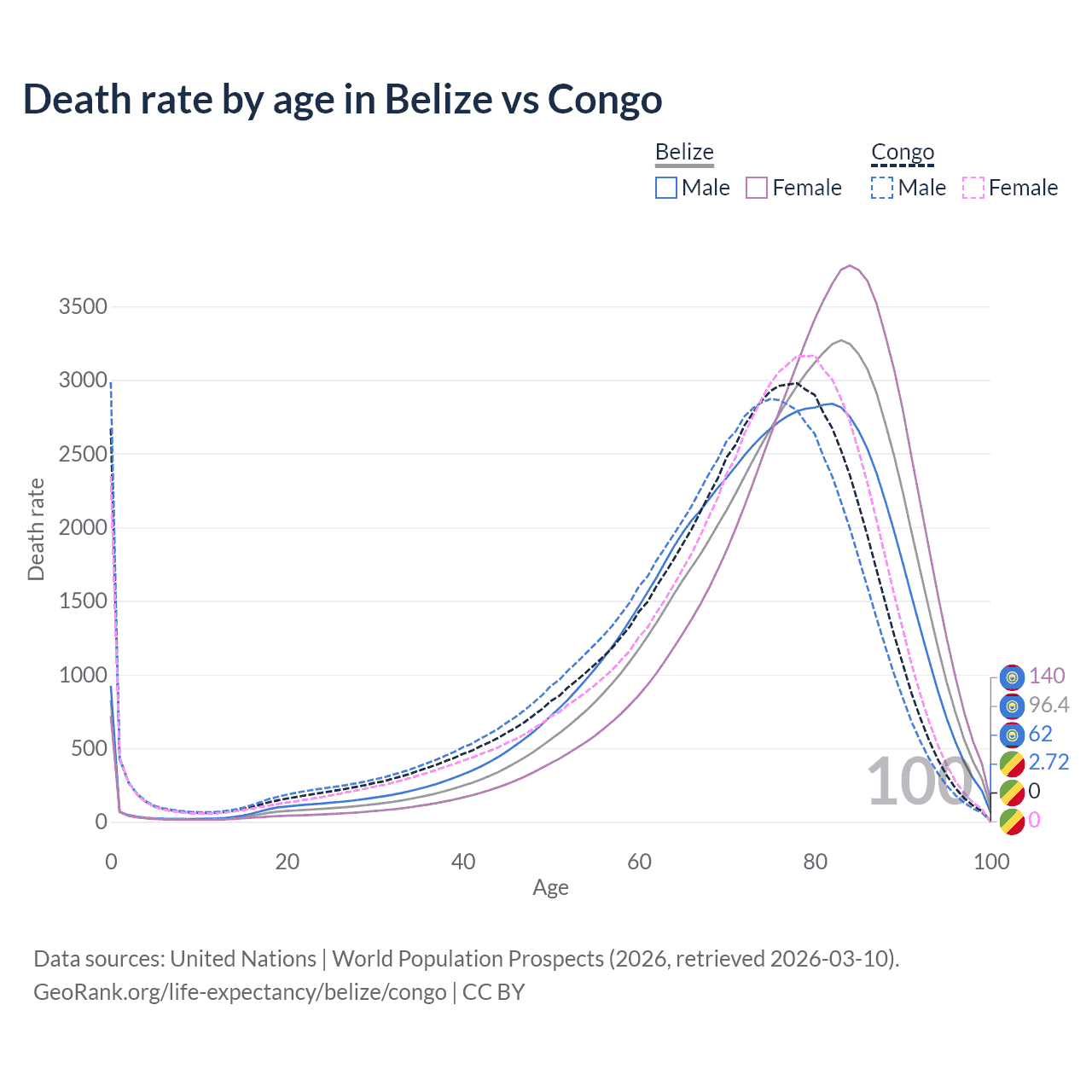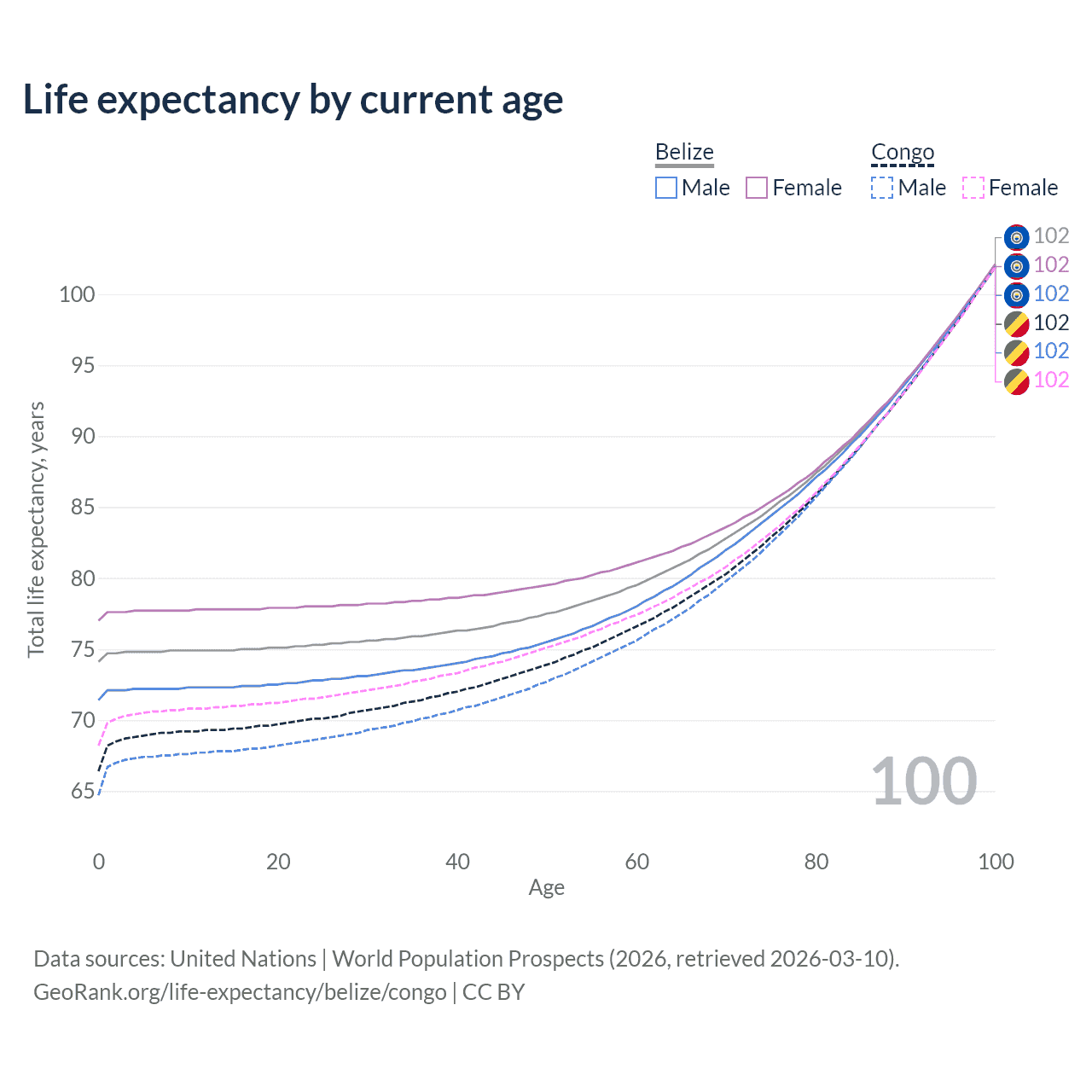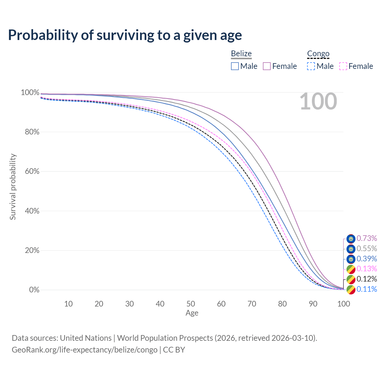 This life expectancy calculator shows the odds of living to 100, 95, 90, and below based on current age for both males and females in Belize and the Congo, along with mean and median age of death. The calculations are based on the 2026 life tables (actuarial tables) from the UN World Population Prospects.