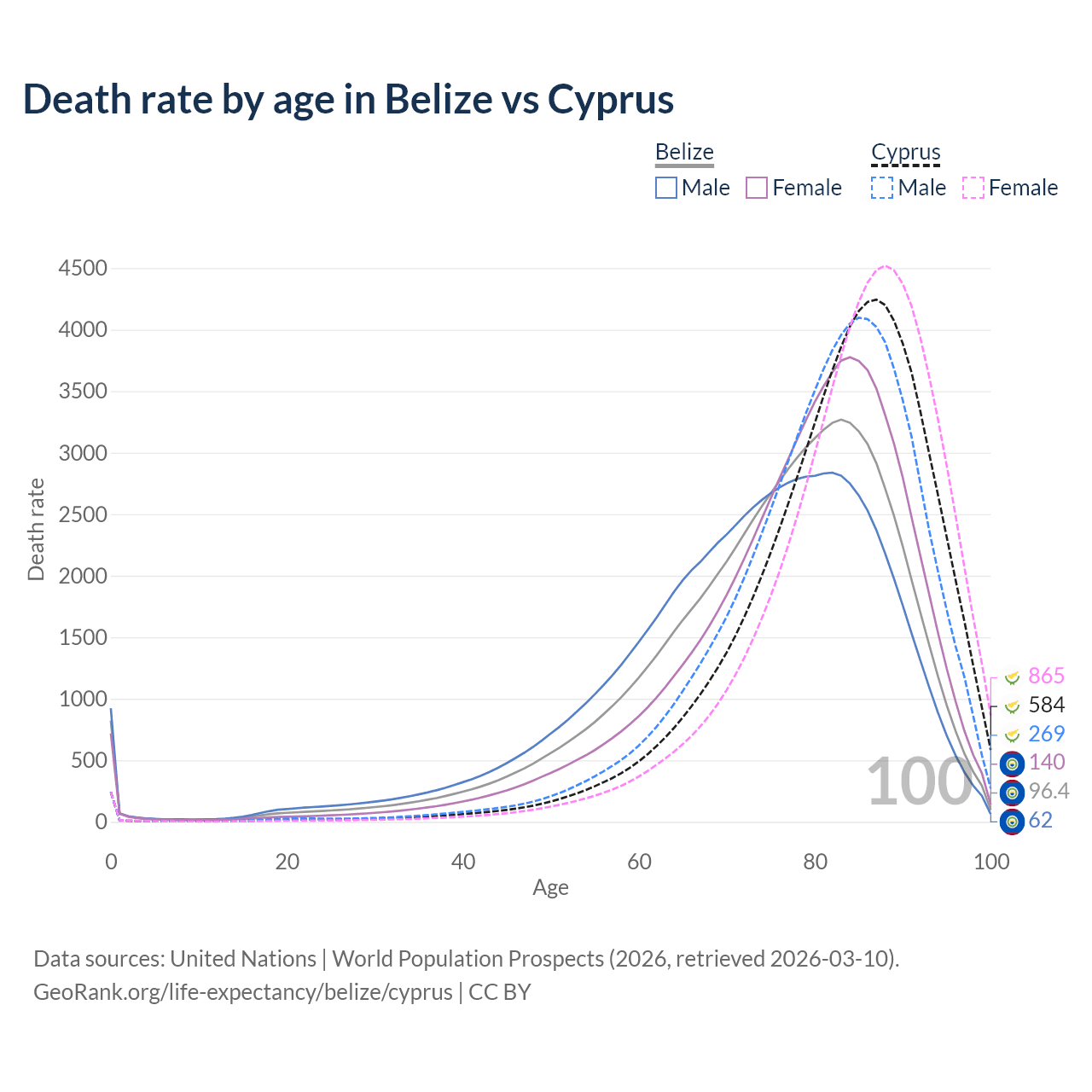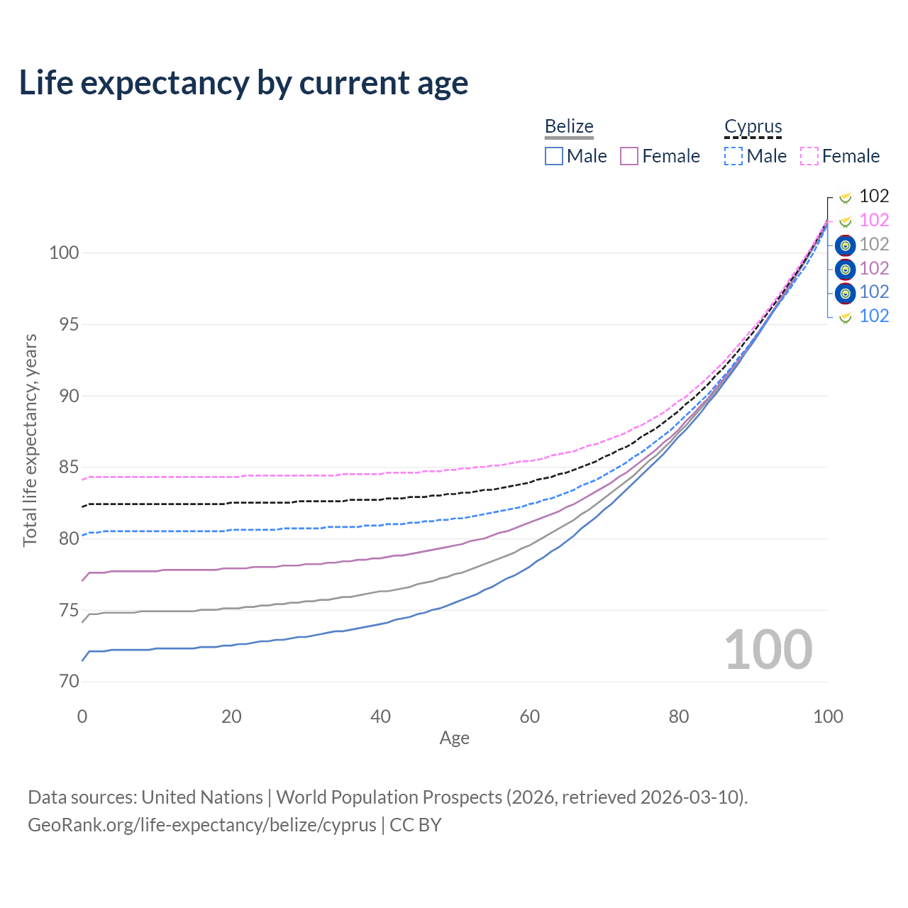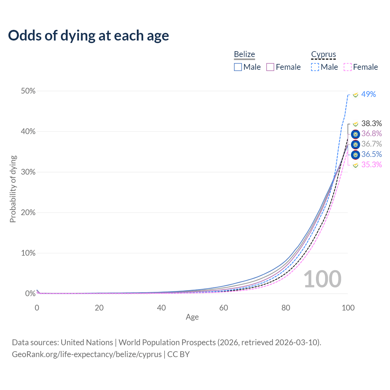This life expectancy calculator shows the odds of living to 100, 95, 90, and below based on current age for both males and females in Belize and Cyprus, along with mean and median age of death. The calculations are based on the 2026 life tables (actuarial tables) from the UN World Population Prospects.