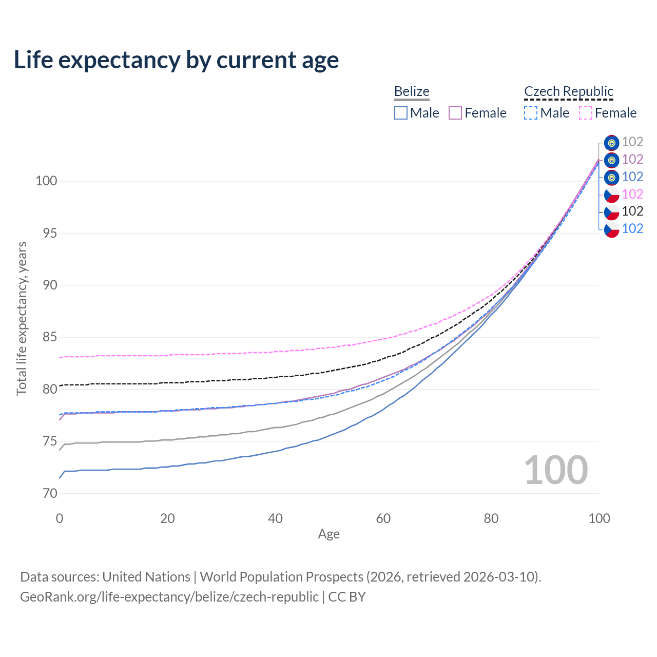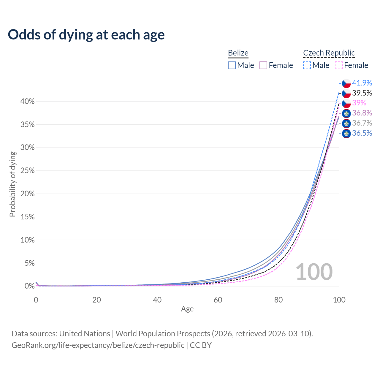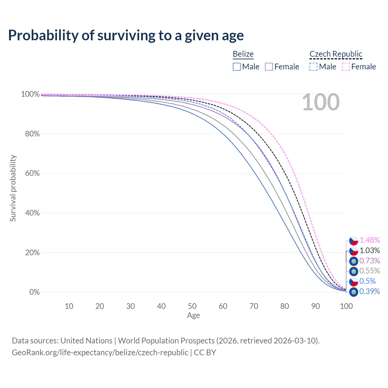 This life expectancy calculator shows the odds of living to 100, 95, 90, and below based on current age for both males and females in Belize and the Czech Republic, along with mean and median age of death. The calculations are based on the 2026 life tables (actuarial tables) from the UN World Population Prospects.
