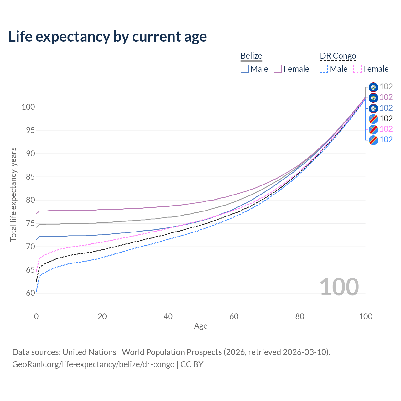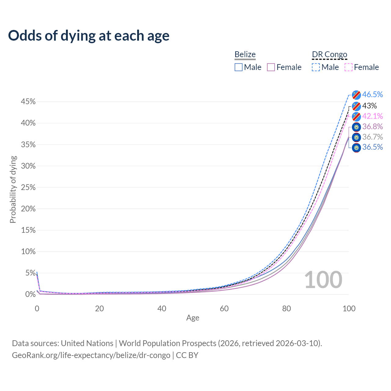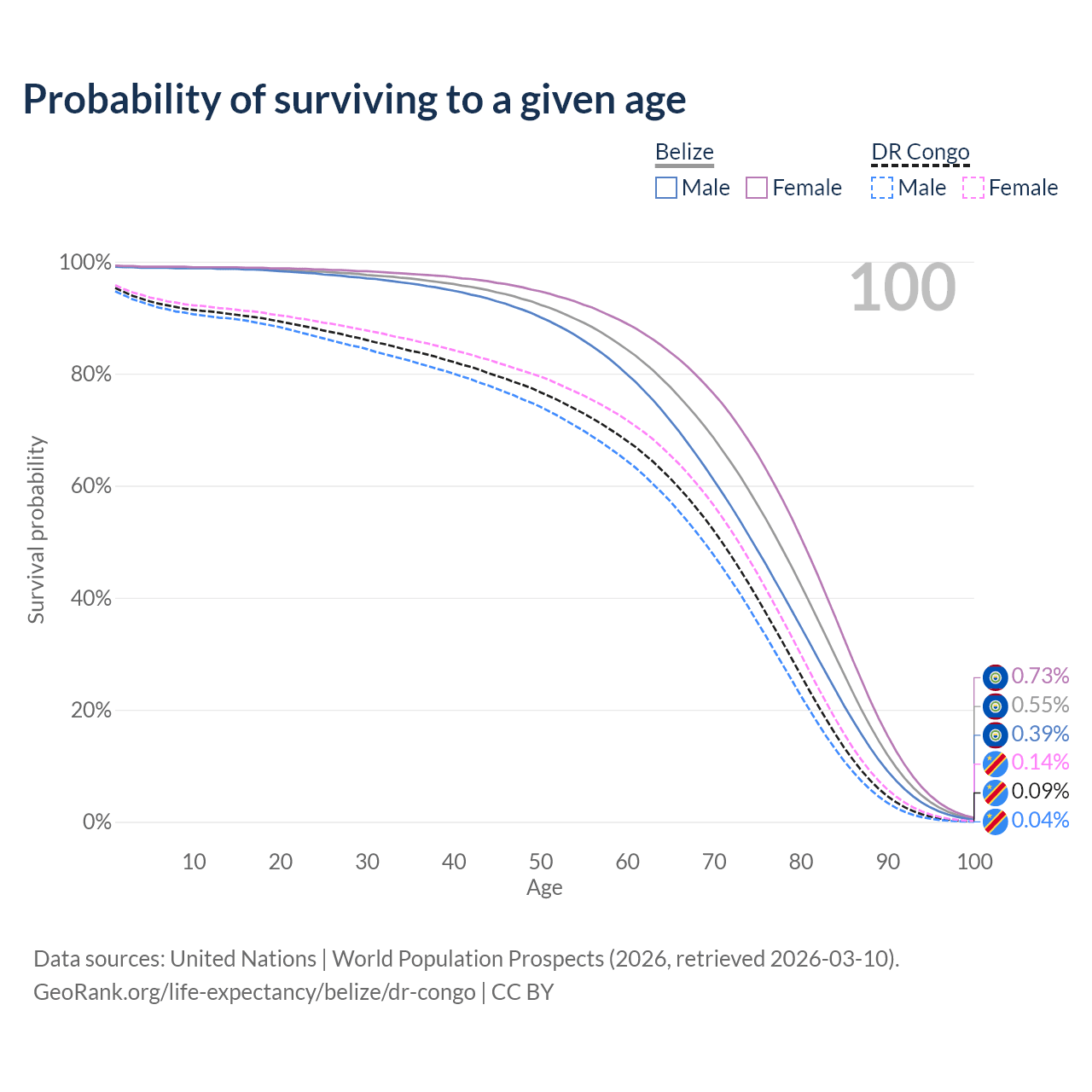 This life expectancy calculator shows the odds of living to 100, 95, 90, and below based on current age for both males and females in Belize and the DR Congo, along with mean and median age of death. The calculations are based on the 2026 life tables (actuarial tables) from the UN World Population Prospects.