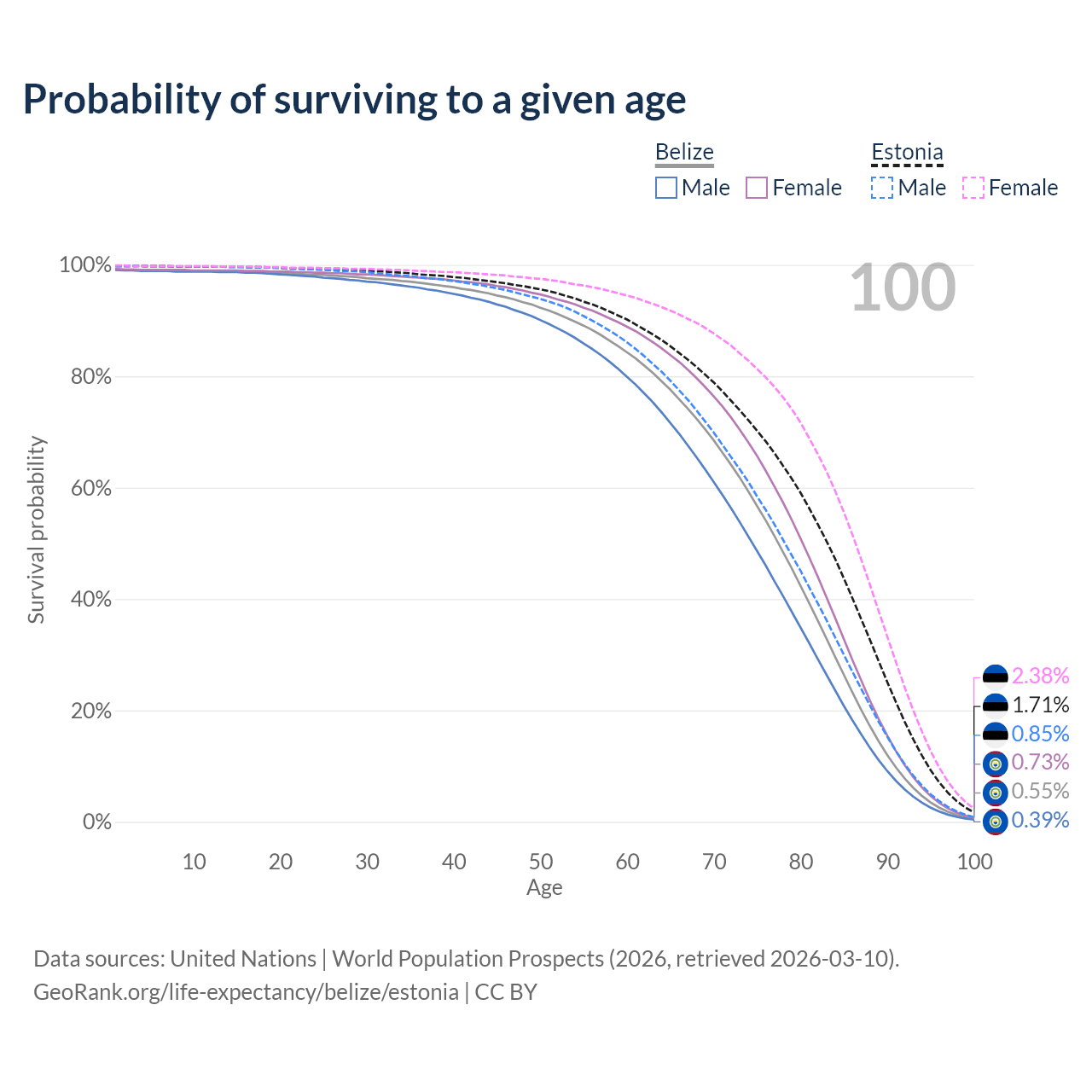 This life expectancy calculator shows the odds of living to 100, 95, 90, and below based on current age for both males and females in Belize and Estonia, along with mean and median age of death. The calculations are based on the 2026 life tables (actuarial tables) from the UN World Population Prospects.