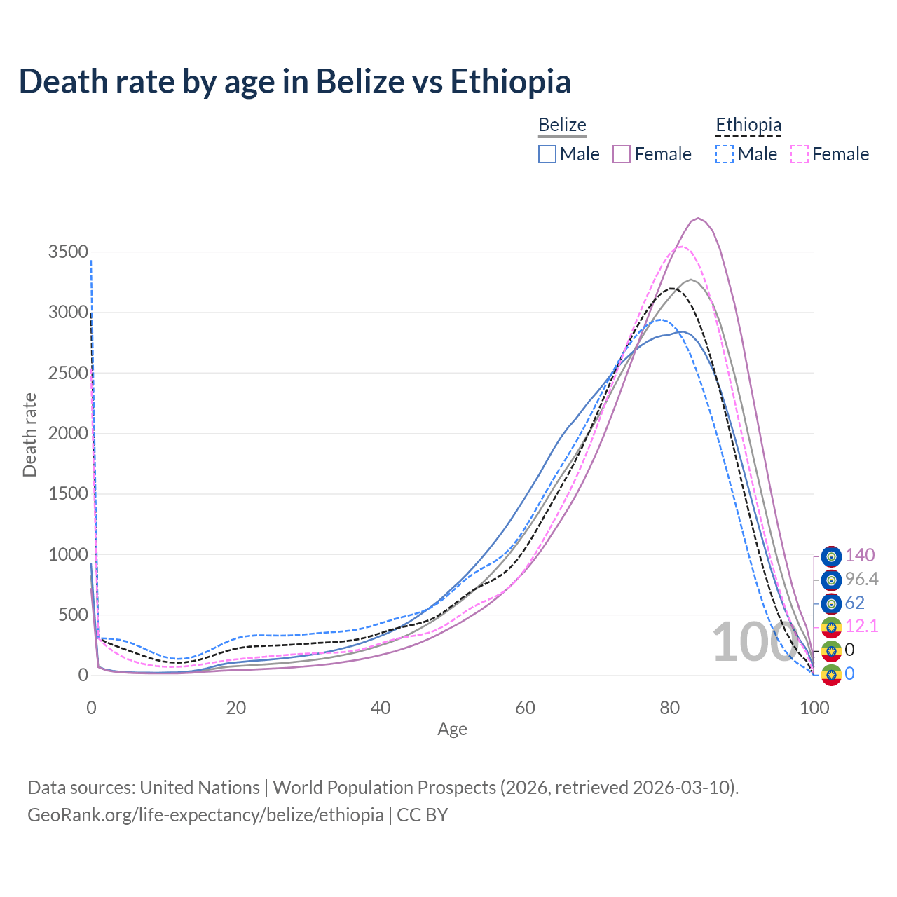 In Belize, the most common age of death is 83, compared to 80 in Ethiopia. The median age of death is 77.5 in Belize and 74.8 in Ethiopia, meaning only half of each cohort is expected to live past that age.