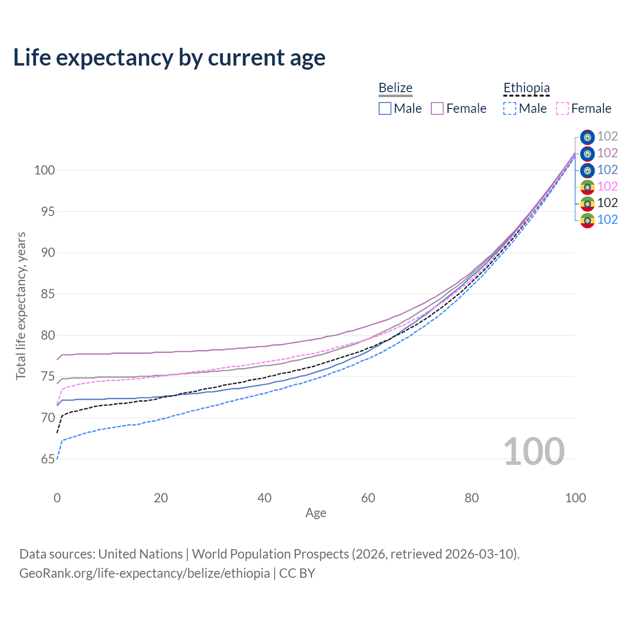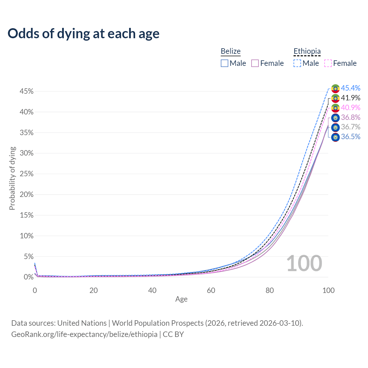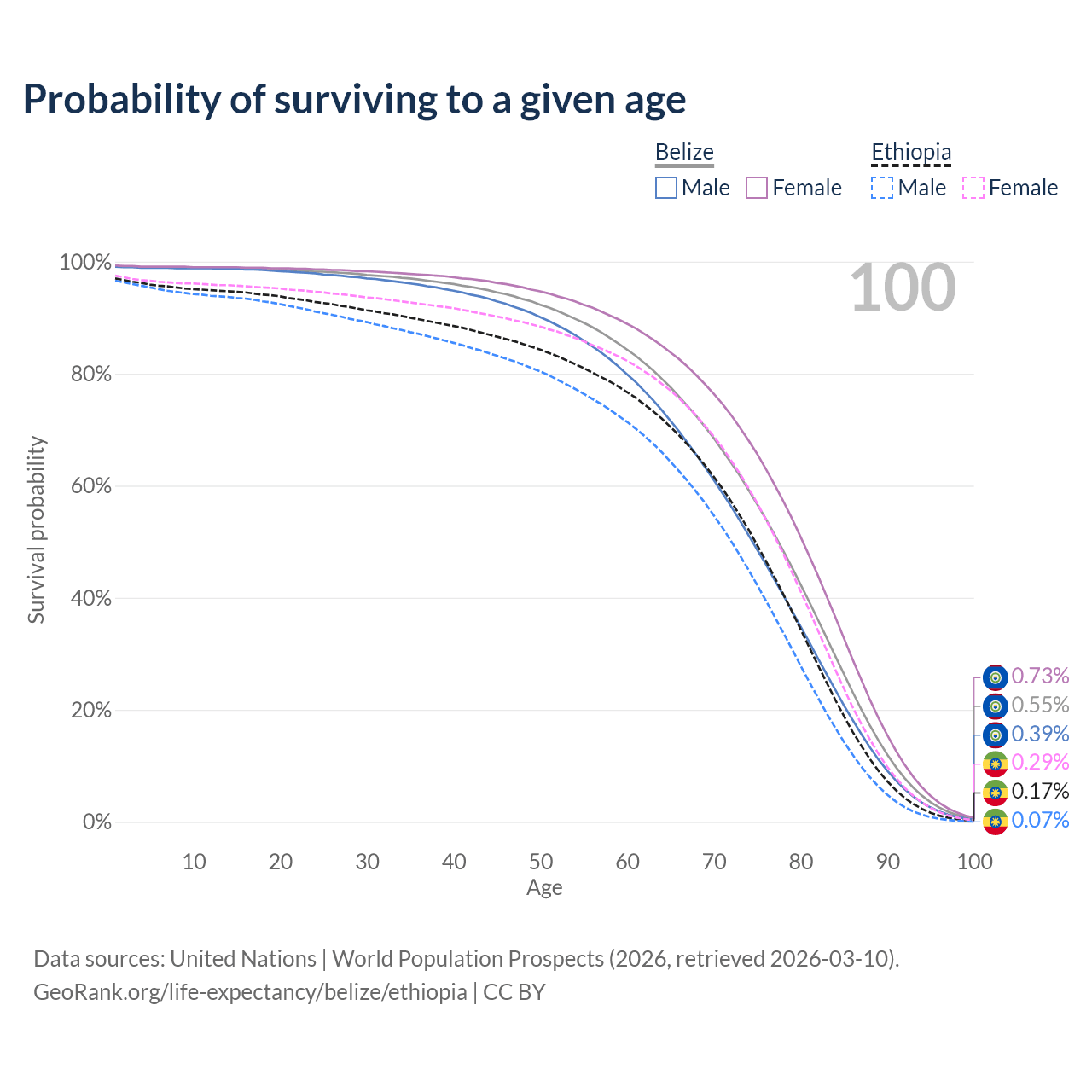 This life expectancy calculator shows the odds of living to 100, 95, 90, and below based on current age for both males and females in Belize and Ethiopia, along with mean and median age of death. The calculations are based on the 2026 life tables (actuarial tables) from the UN World Population Prospects.