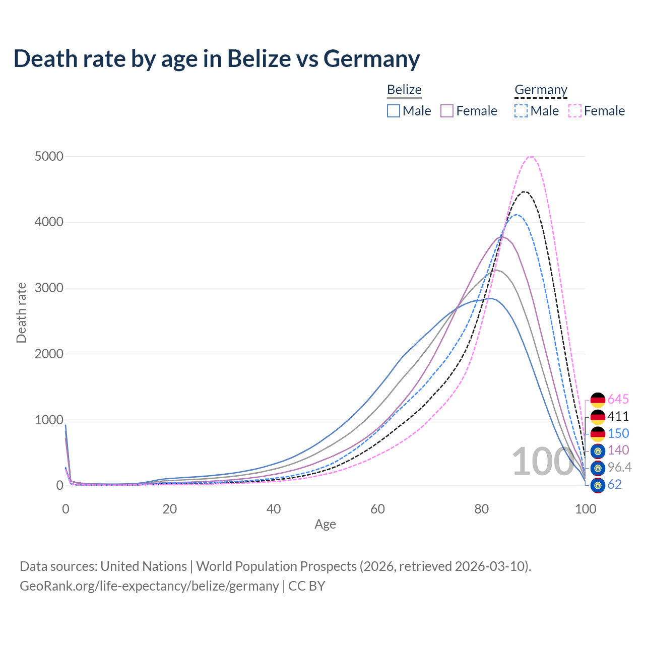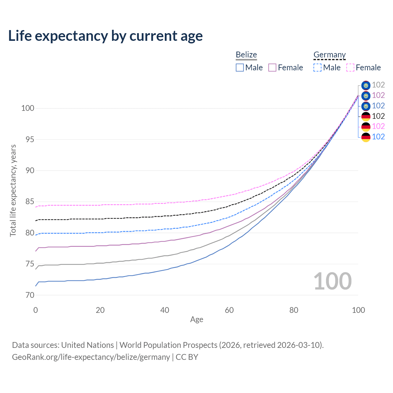 This life expectancy calculator shows the odds of living to 100, 95, 90, and below based on current age for both males and females in Belize and Germany, along with mean and median age of death. The calculations are based on the 2026 life tables (actuarial tables) from the UN World Population Prospects.