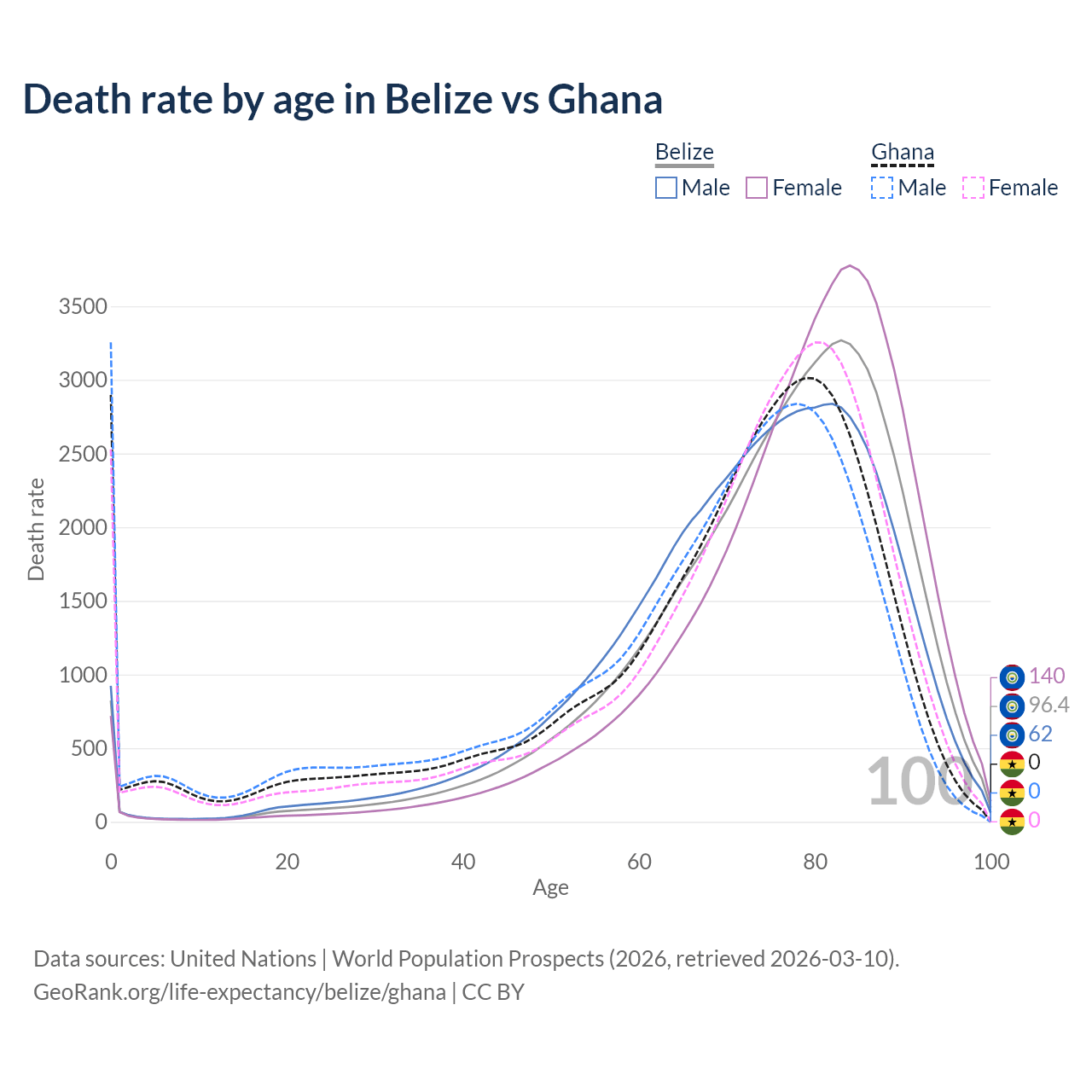 In Belize, the most common age of death is 83, compared to 79 in Ghana. The median age of death is 77.5 in Belize and 73 in Ghana, meaning only half of each cohort is expected to live past that age.