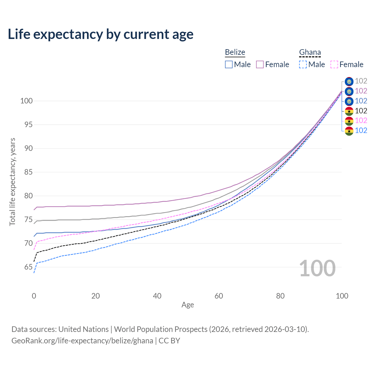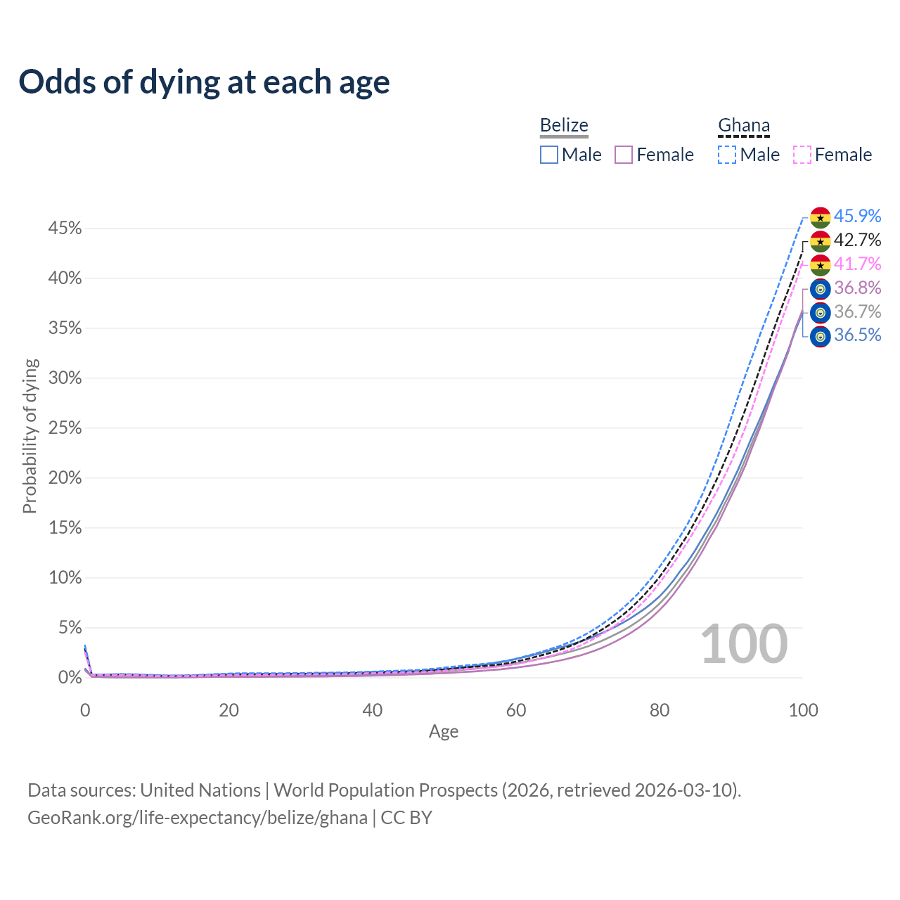 This life expectancy calculator shows the odds of living to 100, 95, 90, and below based on current age for both males and females in Belize and Ghana, along with mean and median age of death. The calculations are based on the 2026 life tables (actuarial tables) from the UN World Population Prospects.