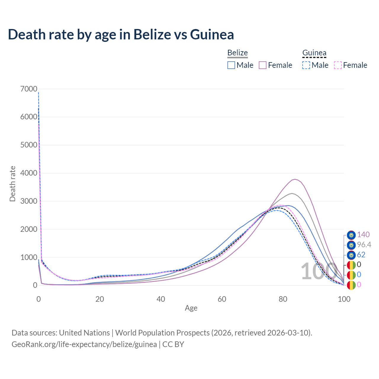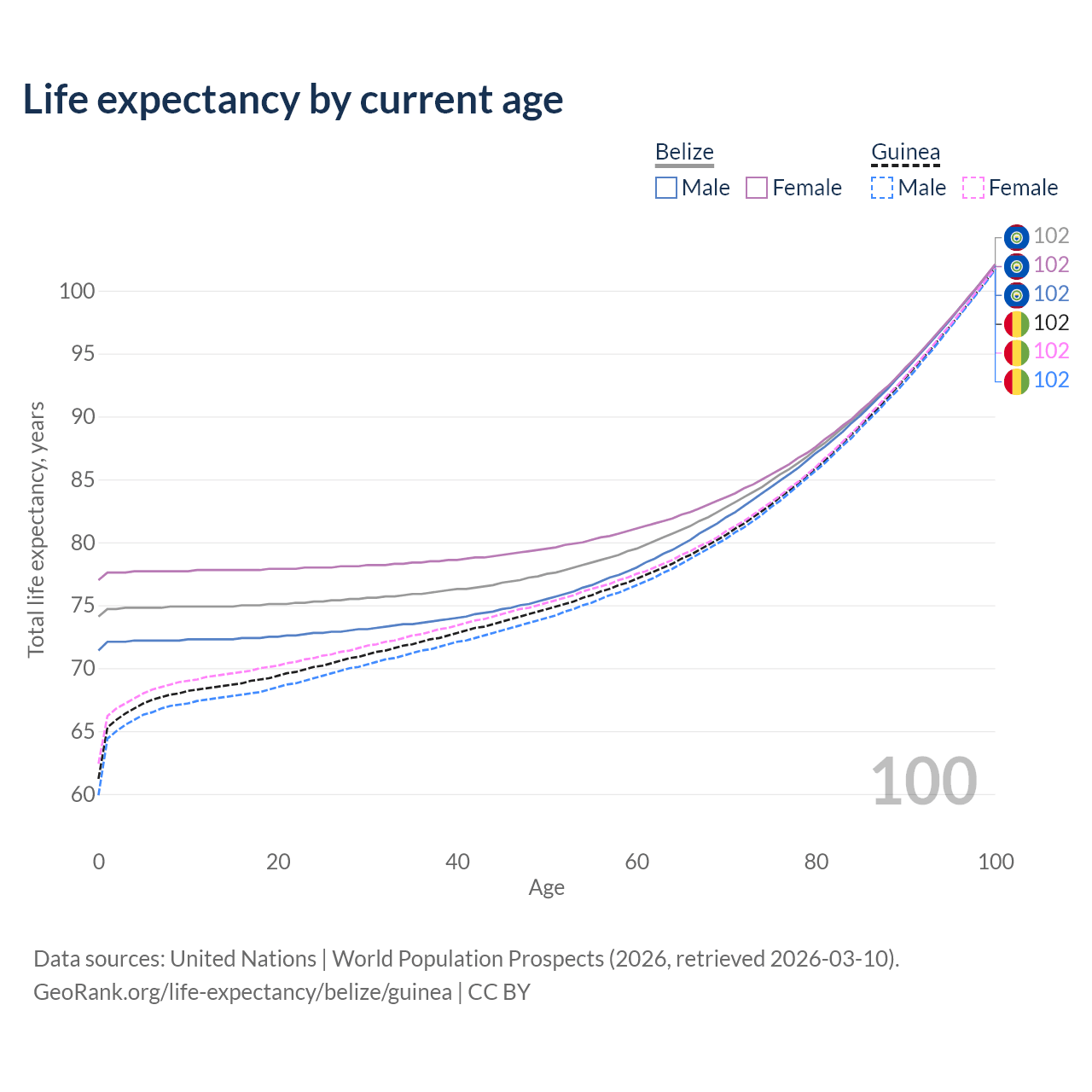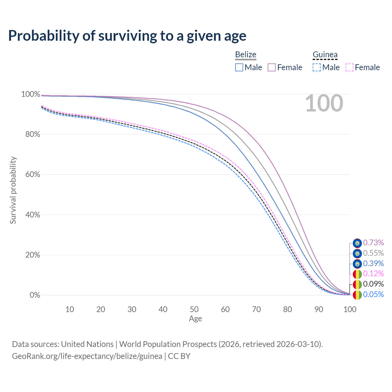 This life expectancy calculator shows the odds of living to 100, 95, 90, and below based on current age for both males and females in Belize and Guinea, along with mean and median age of death. The calculations are based on the 2026 life tables (actuarial tables) from the UN World Population Prospects.