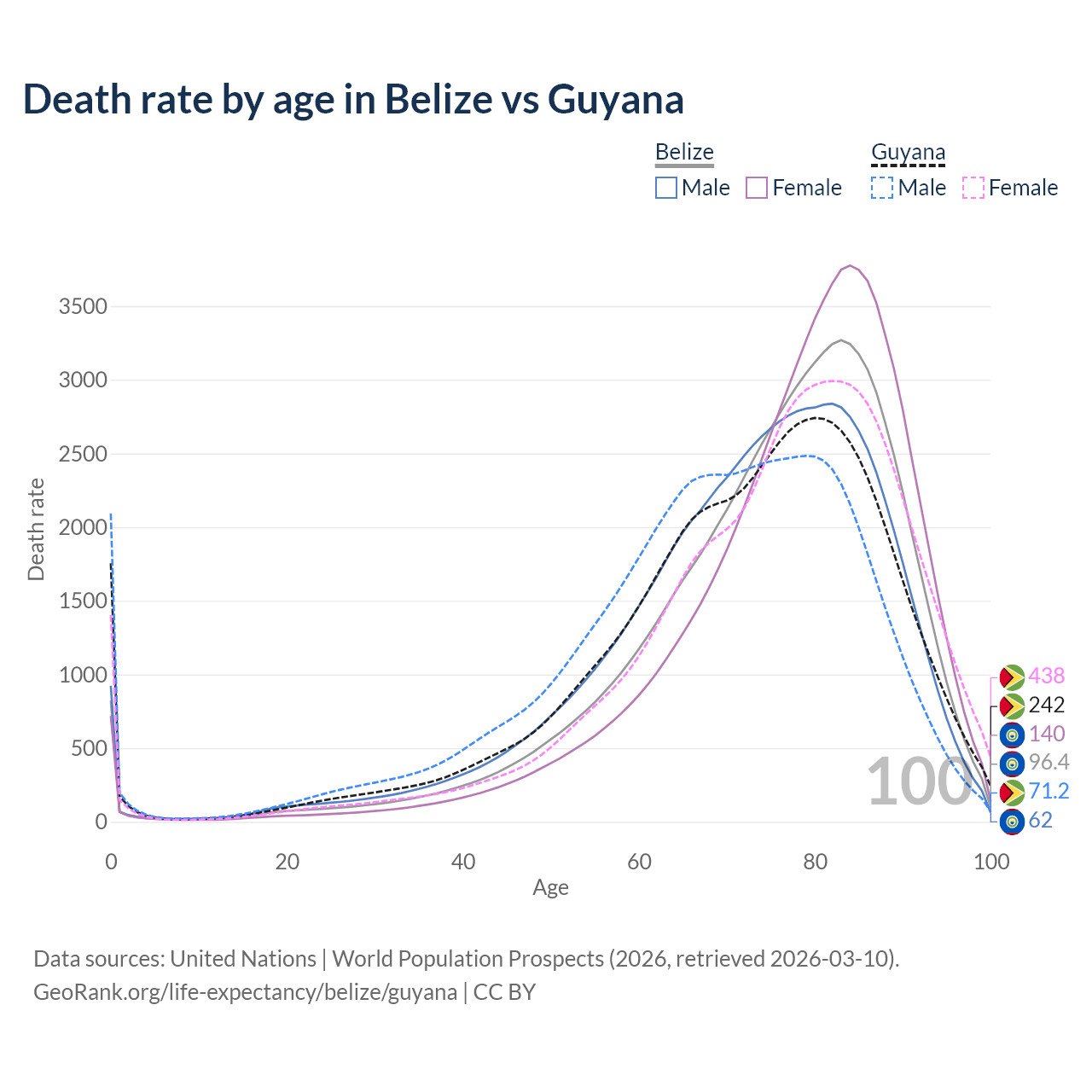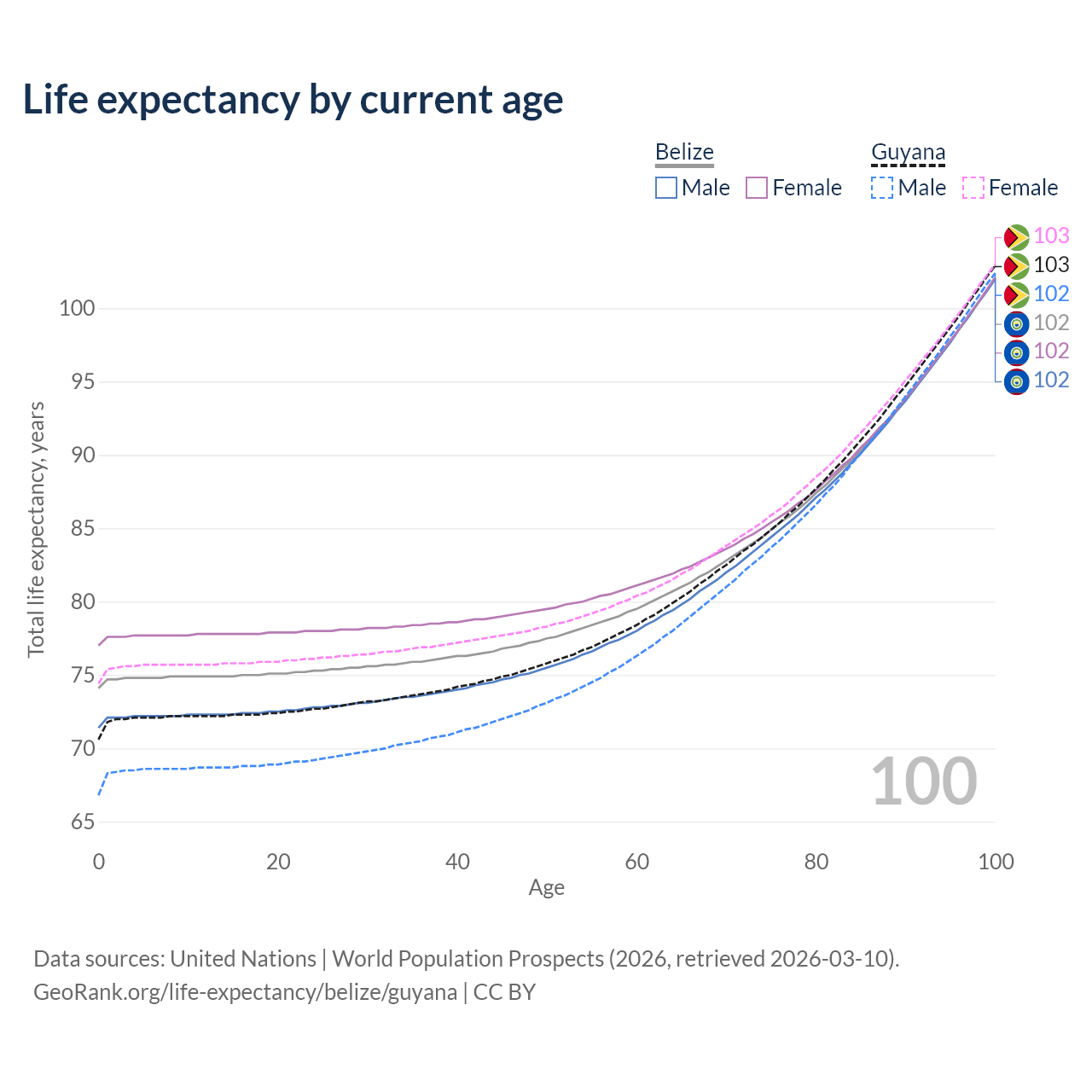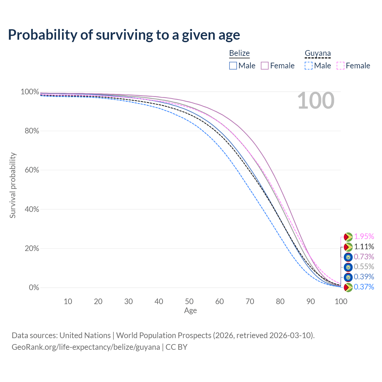 This life expectancy calculator shows the odds of living to 100, 95, 90, and below based on current age for both males and females in Belize and Guyana, along with mean and median age of death. The calculations are based on the 2026 life tables (actuarial tables) from the UN World Population Prospects.