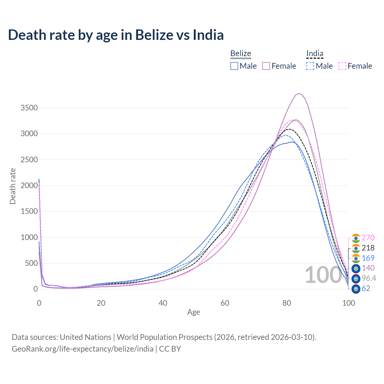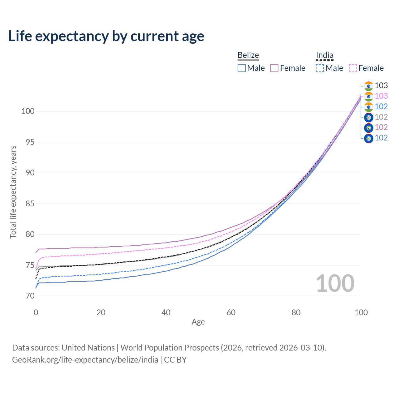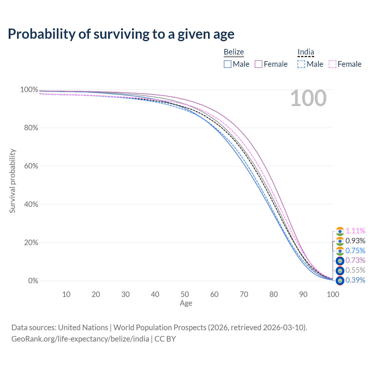 This life expectancy calculator shows the odds of living to 100, 95, 90, and below based on current age for both males and females in Belize and India, along with mean and median age of death. The calculations are based on the 2026 life tables (actuarial tables) from the UN World Population Prospects.