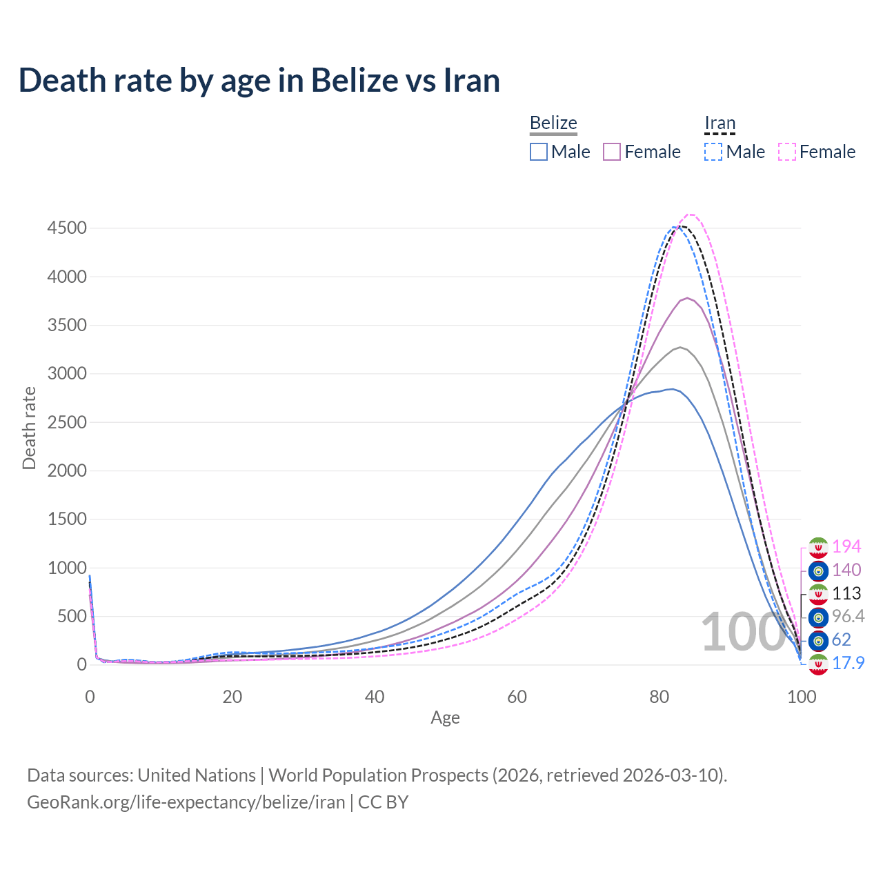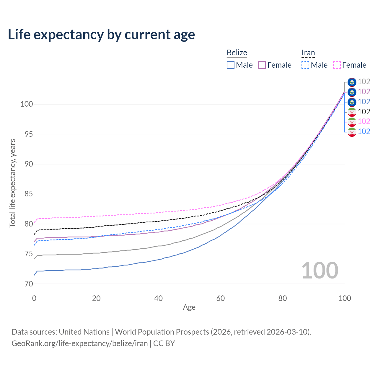 This life expectancy calculator shows the odds of living to 100, 95, 90, and below based on current age for both males and females in Belize and Iran, along with mean and median age of death. The calculations are based on the 2026 life tables (actuarial tables) from the UN World Population Prospects.