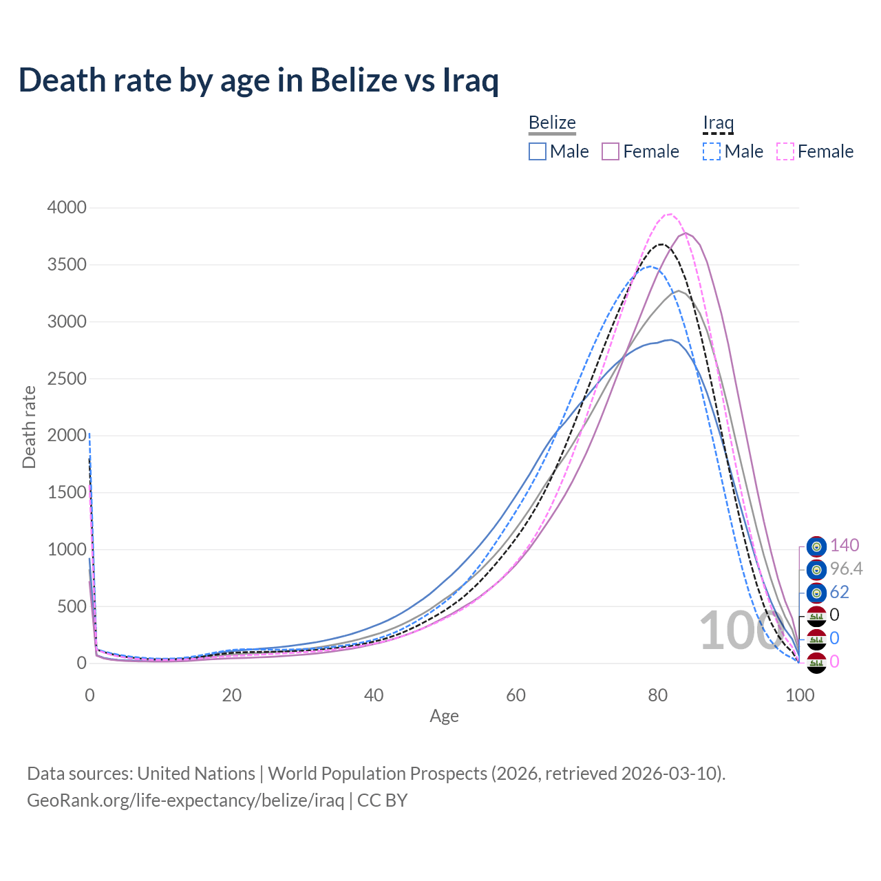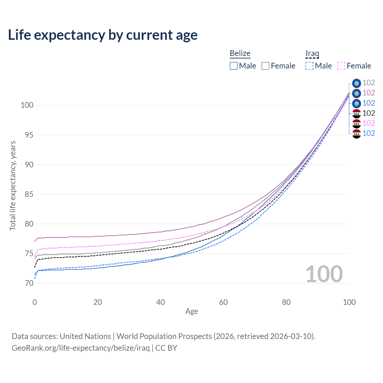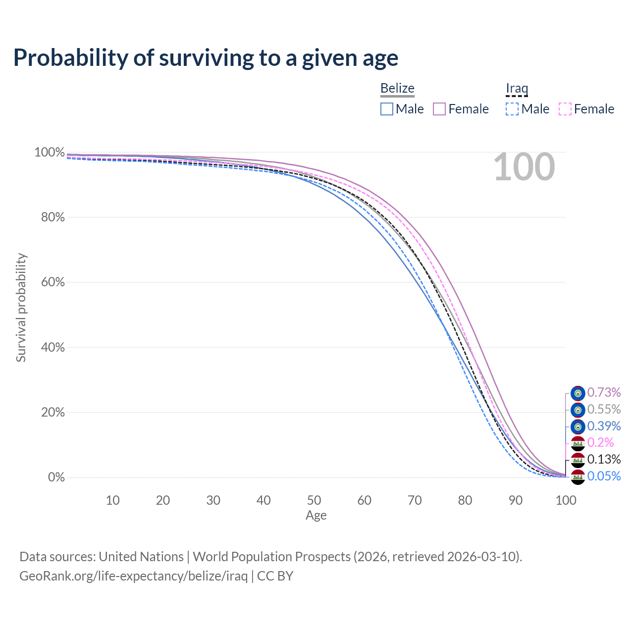 This life expectancy calculator shows the odds of living to 100, 95, 90, and below based on current age for both males and females in Belize and Iraq, along with mean and median age of death. The calculations are based on the 2026 life tables (actuarial tables) from the UN World Population Prospects.