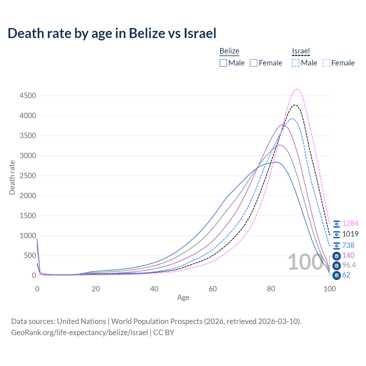 In Belize, the most common age of death is 83, compared to 88 in Israel. The median age of death is 77.5 in Belize and 85.6 in Israel, meaning only half of each cohort is expected to live past that age.