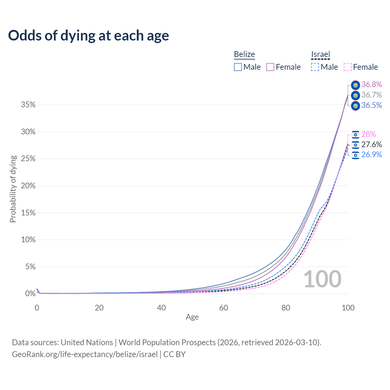 This life expectancy calculator shows the odds of living to 100, 95, 90, and below based on current age for both males and females in Belize and Israel, along with mean and median age of death. The calculations are based on the 2026 life tables (actuarial tables) from the UN World Population Prospects.