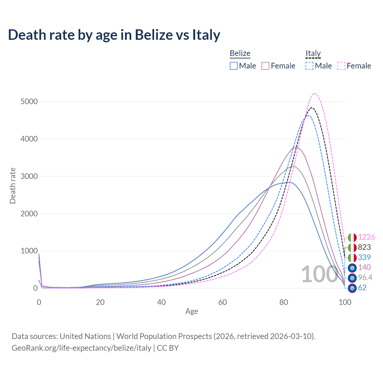 In Belize, the most common age of death is 83, compared to 89 in Italy. The median age of death is 77.5 in Belize and 86.9 in Italy, meaning only half of each cohort is expected to live past that age.